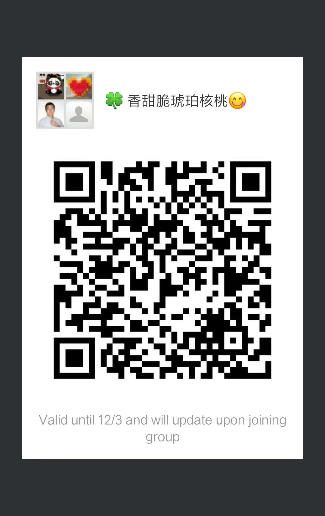 村里没有正宗好吃的琥珀核桃怎么办? 从国内网购邮资不说,还要等等等,怎么办? 来来来,香脆甜的琥珀核桃了解一下~~~ 纯手工制作,非油炸,保留核桃本身的营养价值和味道,香甜酥脆,棕红晶亮。 家庭小作坊,$4/100g,每日制作量有限,想吃的朋友请扫描图片二维码加微信。