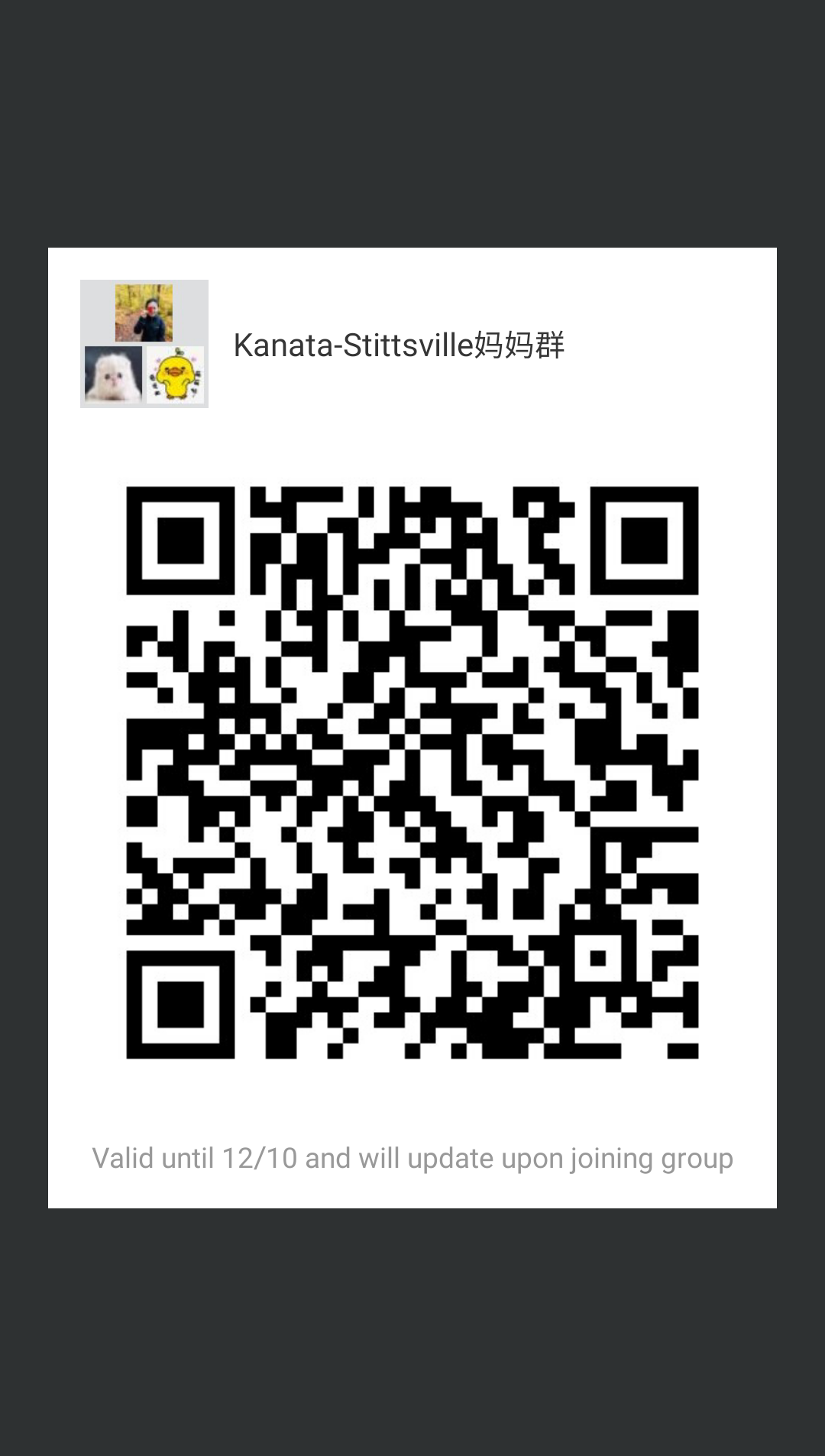 N Nordic 新手上路 注册 2016-12-22 消息 19 荣誉分数 6 声望点数 13 2018-12-08 #1 为了更好的和住在Stittsville-Kanata地区的妈妈门交流,新建了一个Stittsville-Kanata妈妈微信群。扫QR码进入。 附件 mmqrcode1543854594000.png 160.8 KB · 查看: 189