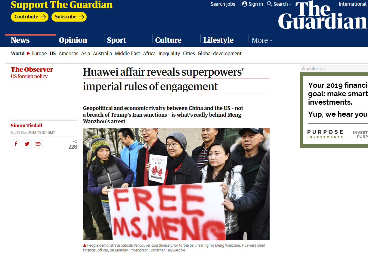 Foremost among them is China – a rival, not a friend – whose furious reaction last week to the arrest in Canada, on a US warrant, of the top Huawei executive, Meng Wanzhou, showed how Washington’s presumptuous attempts to exercise universal jurisdiction have become outdated, objectionable – and increasingly unenforceable.