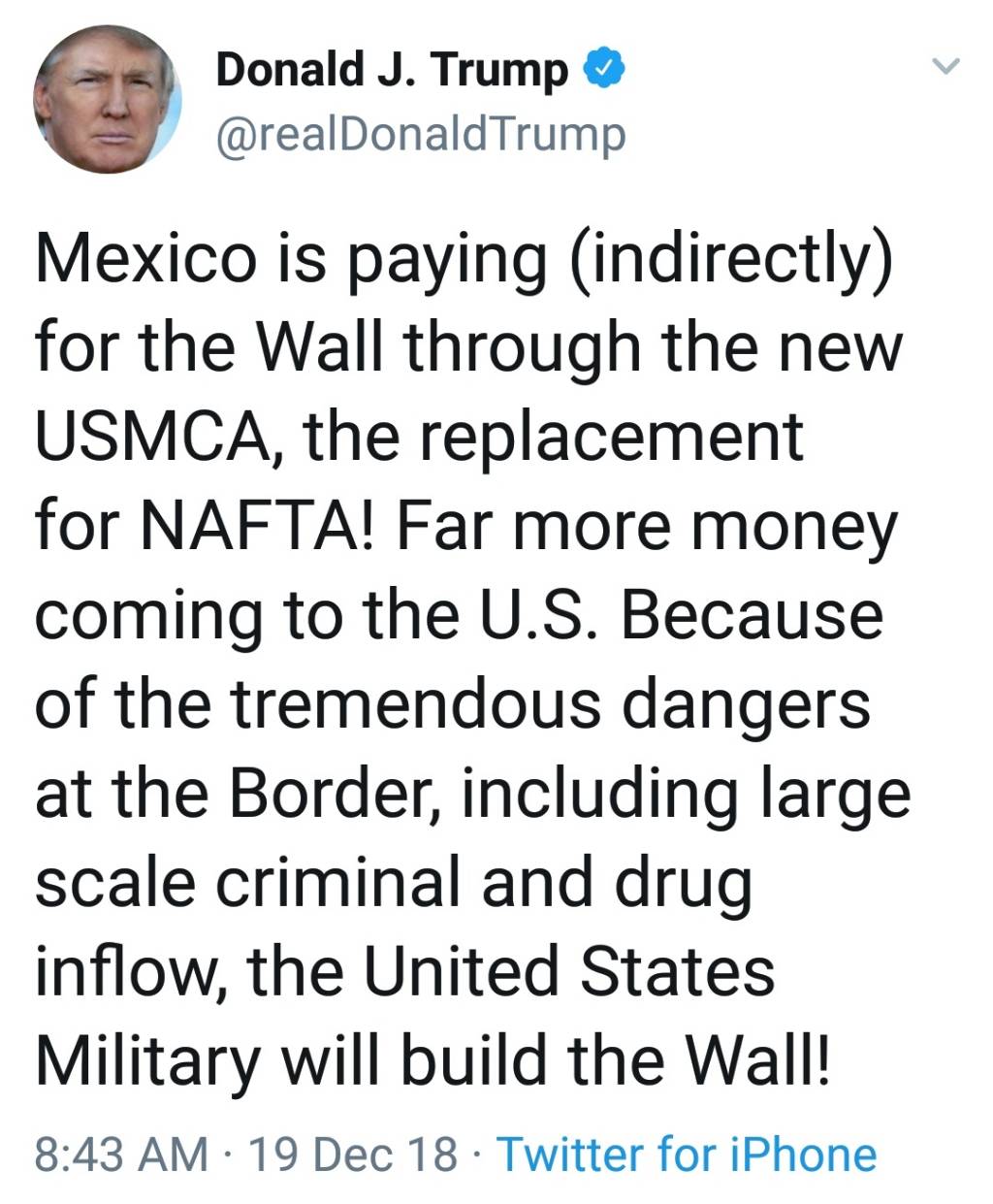 老床的手法其实很老道。那么有看官问了:“为什么共和党掌控参众两院的时候不修墙?” 答案就是一个字 "钱!",建墙资金没落实。上台的时候老床就说了,让墨西哥人出钱建墙,众人不信。怎么落实的呢?通过重签北美自由贸易协定明着”黑了“墨西哥一把。一经签订,老床立马要建墙。现在看来老床并没有吹牛,的确是老墨出钱建墙,只不过拐了个湾儿。老床逼迫加、墨速签自贸协定有更深一层的道理,可以说环环紧扣,智近乎于妖。