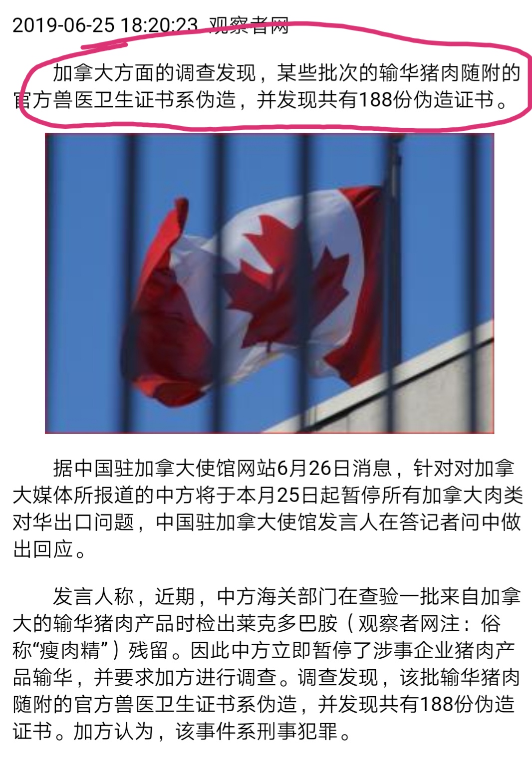 这事虽然不咋地,但是我还是得给加拿大政府点个赞,能够不护短及时通报。原来加拿大用的是伪造的猪肉合格证书啊!