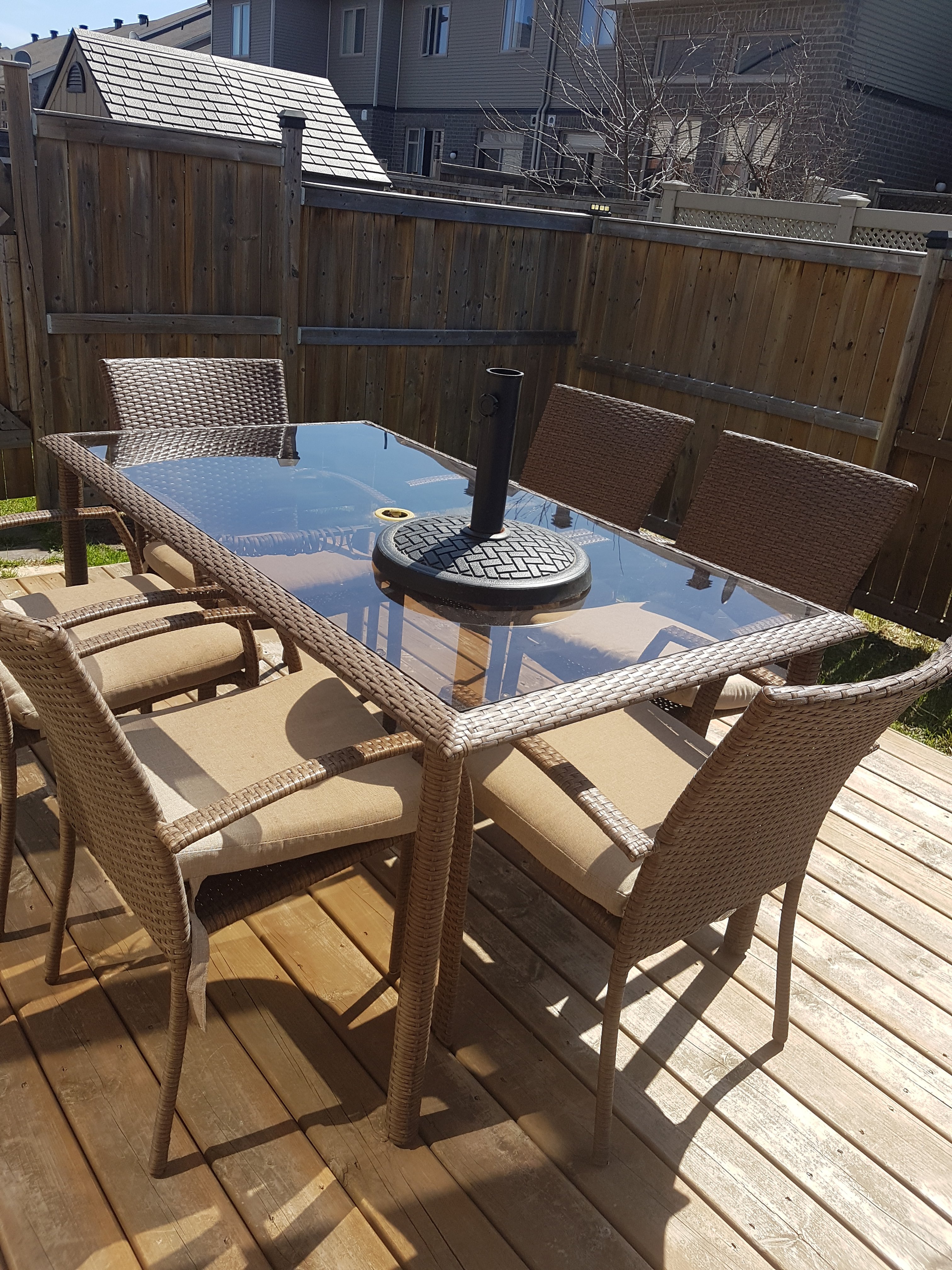 出home depot picnic table, 桌子连八张带护垫藤椅$200