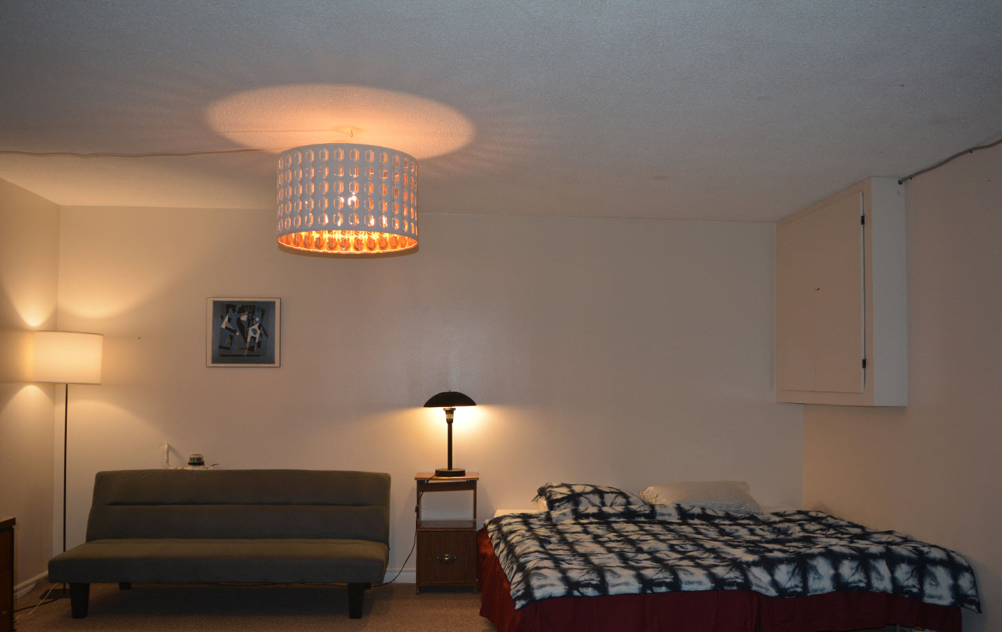 这个Bachelor房间大约有30 -33 平米。在basement。里面有Queen size床,桌子和椅子,一个小厨房(和一个卫生间(带淋浴厕所洗手池)。只合用洗衣房, 大门.