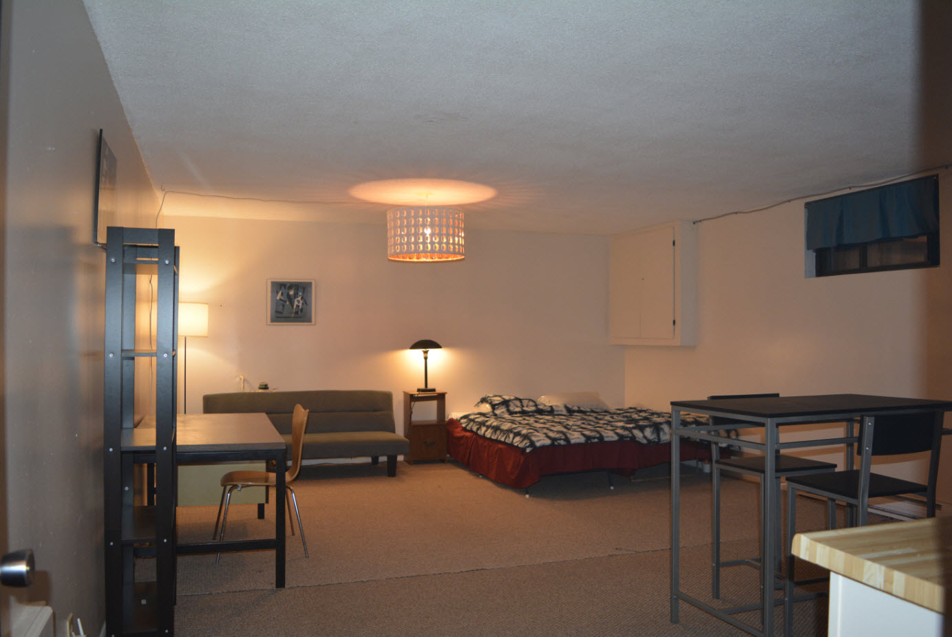 这个Bachelor房间大约有30 -33 平米。在basement。里面有Queen size床,桌子和椅子,一个小厨房(和一个卫生间(带淋浴厕所洗手池)。只合用洗衣房, 大门.