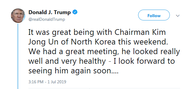 Leaving South Korea after a wonderful meeting with Chairman Kim Jong Un. Stood on the soil of North Korea, an important statement for all, and a great honor!