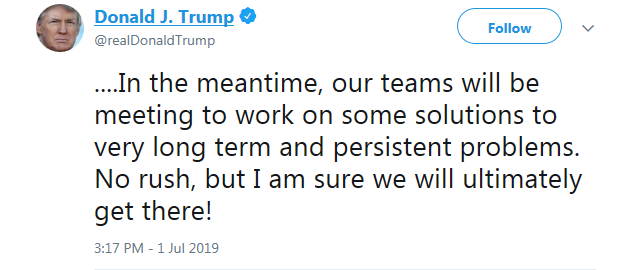 ....again with China as our relationship with them continues to be a very good one. The quality of the transaction is far more important to me than speed. I am in no hurry, but things look very good! There will be no reduction in the Tariffs currently being charged to China.
