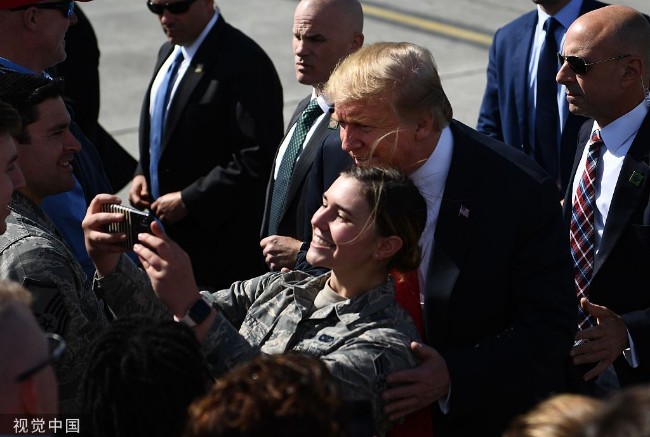 5月25日报道,当地时间5月24日,美国阿拉斯加州,美国总统唐纳德·特朗普专机在前往日本途中抵达埃尔门多夫空军基地进行加油,期间特朗普向军方人员致意。美国总统特朗普将前往日本进行为期三天的正式访问。