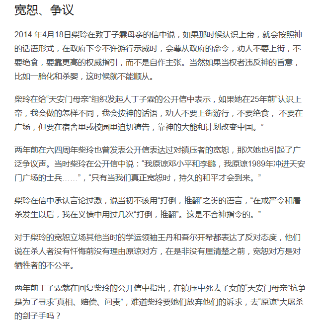 2012年6月4日,柴玲也曾以英文发表公开信,表示因为耶稣,原谅了当年冲进天安门广场的解放军以及当时的中共领导人邓小平和李鹏, 同样引起轩然大波,并引发相关人士的强烈谴责。