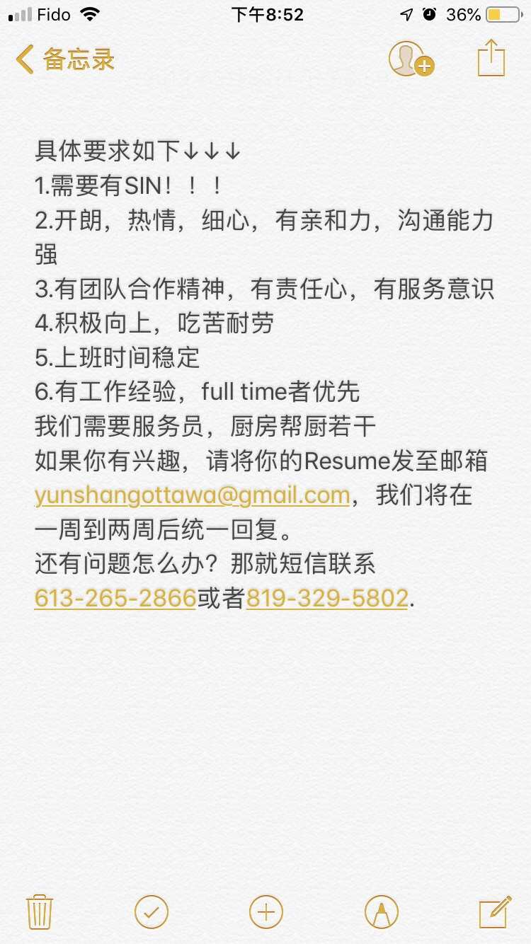 cristianohao 说: 您好 我们还在招人 请将你的Resume发至邮箱 yunshangottawa@gmail.com, 我们经过审核过会统一安排面试时间 点击展开... 请问学生part time也招吗?