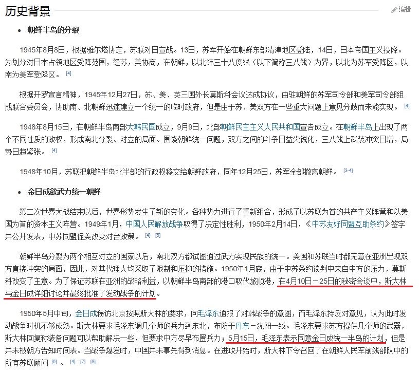 ccc 说: 头脑不能固化,看问题不能僵化停留在教科书上啊。看看百度,已经不是你当年学的那样啦。 浏览附件844872 https://baike.baidu.com/item/抗美援朝/383?fromtitle=抗美援朝战争&fromid=1214692 点击展开... 朝鲜战争是斯大林和金日成蓄谋,并得到毛泽东的同意,由朝鲜发动的一场侵略战争。 其他的,那就由人嘴的两张皮去说了。