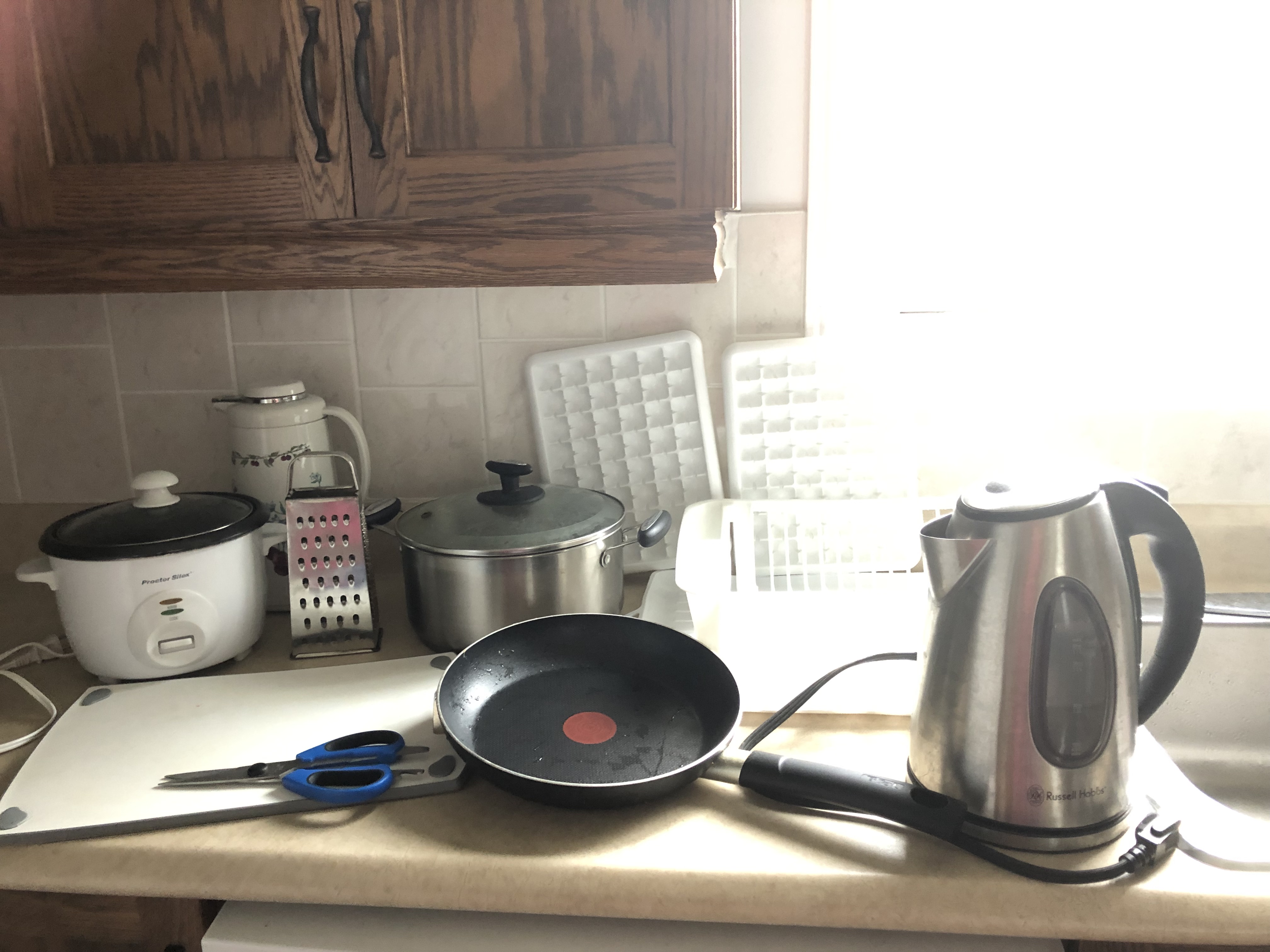 - 电饭锅, 不锈钢煮锅, 不沾炒锅, 开水壶, 水瓶, 菜板 $50 另送剪刀, 碗架, 叉子, 勺子和杯子