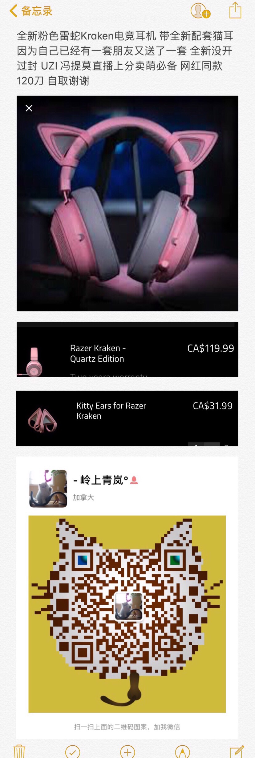 U ulala 新手上路 注册 2017-02-09 消息 22 荣誉分数 0 声望点数 11 2019-08-09 #1 全新粉色雷蛇Kraken电竞耳机 带全新配套猫耳 因为自己已经有一套朋友又送了一套 全新没开过封 UZI 冯提莫直播上分卖萌必备 网红同款120刀 自取谢谢 附件 IMG_0479.JPG 416 KB · 查看: 38