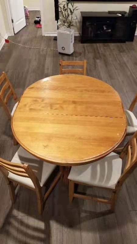 我家有一套实木餐桌椅出卖,五张椅子,桌子是椭圆型,人少也可以转变成圆型,价格$150 联系电话:613-491-3368