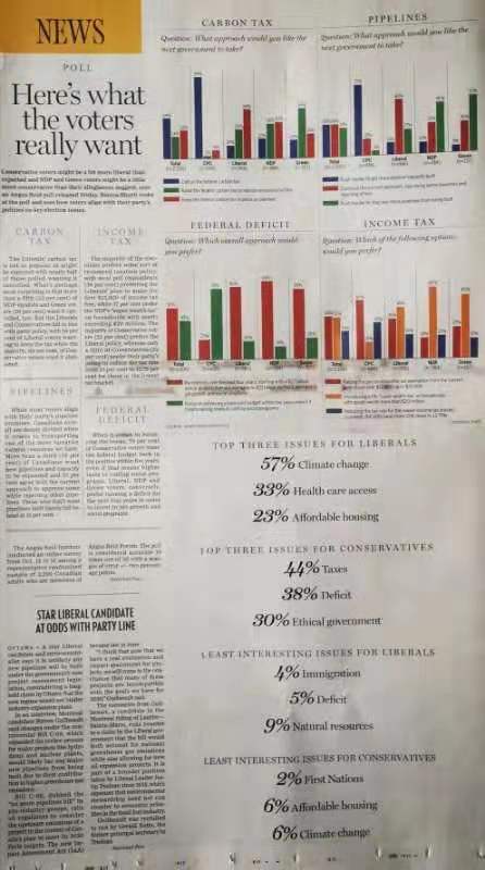 请看上文细节,保守党与三个左派党的执政纲领的对比,差别太大了,特别在碳税、收入税、油管线和赤字四方面,几乎是水火不容,针锋相对。