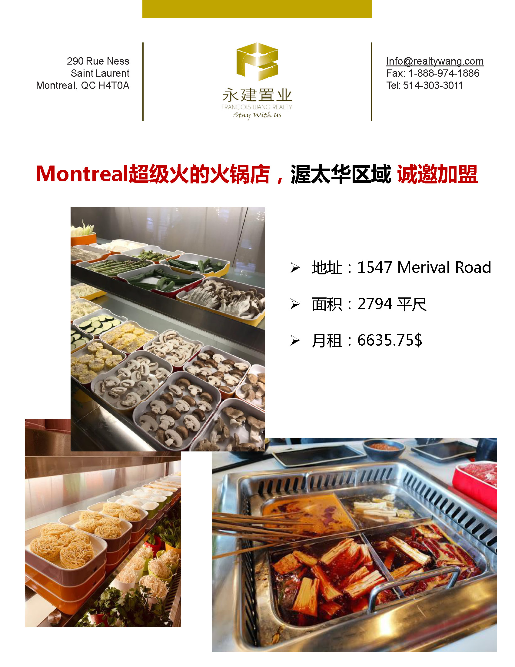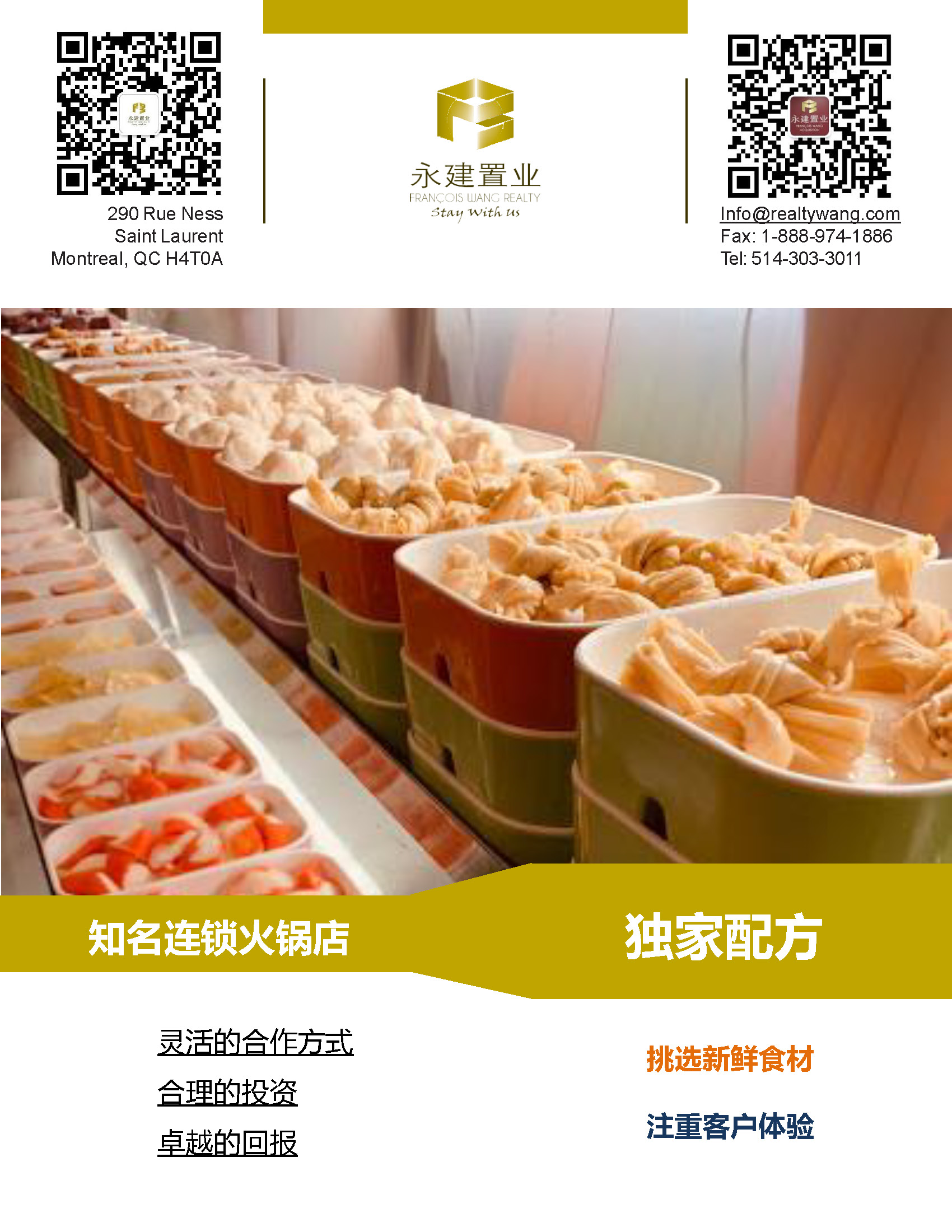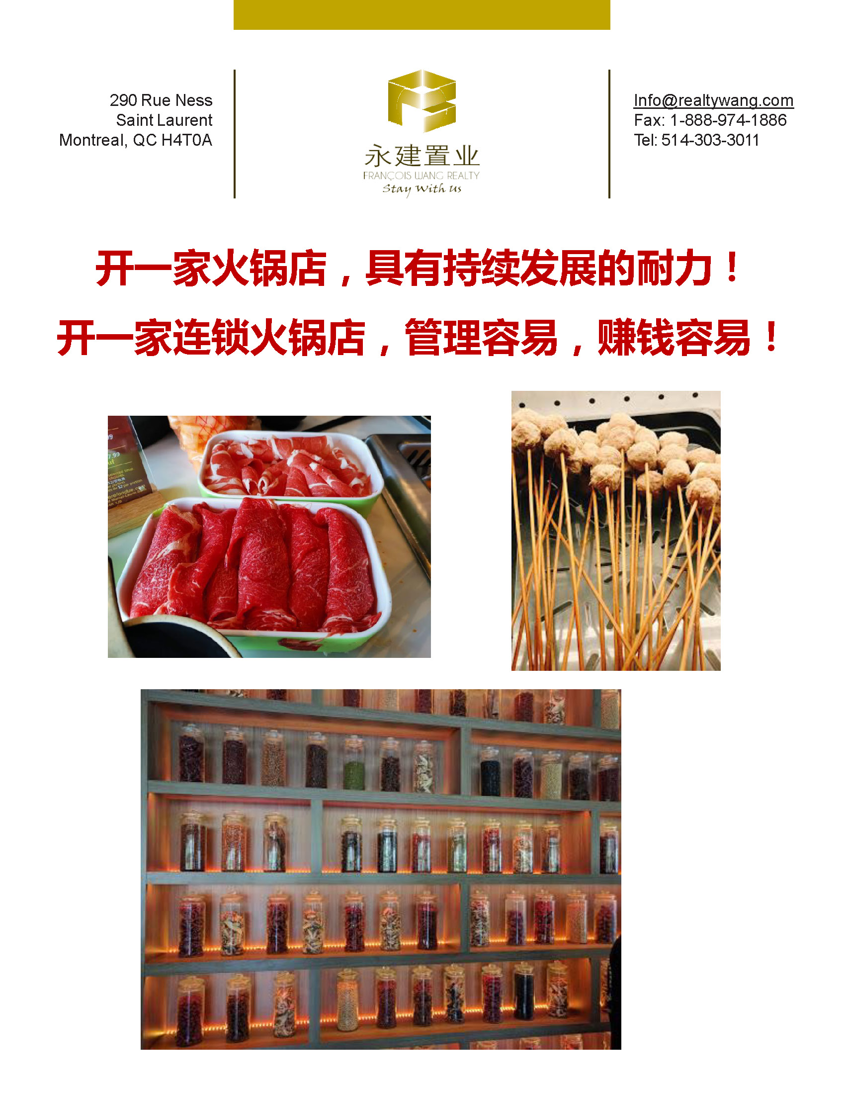 想成为火锅连锁加盟商的朋友们不要错过这最佳商机,在Montreal超级火的知名连锁火锅店,现在渥太华区域诚招加盟,好位置,客源丰富,开店就赚钱,连锁生意容易上手,感兴趣的朋友们千万不要错过这个加盟商机。