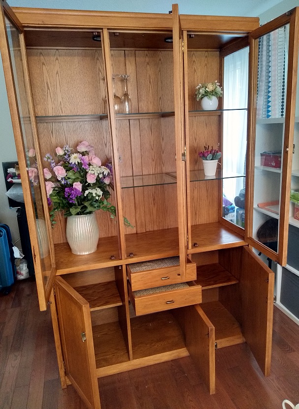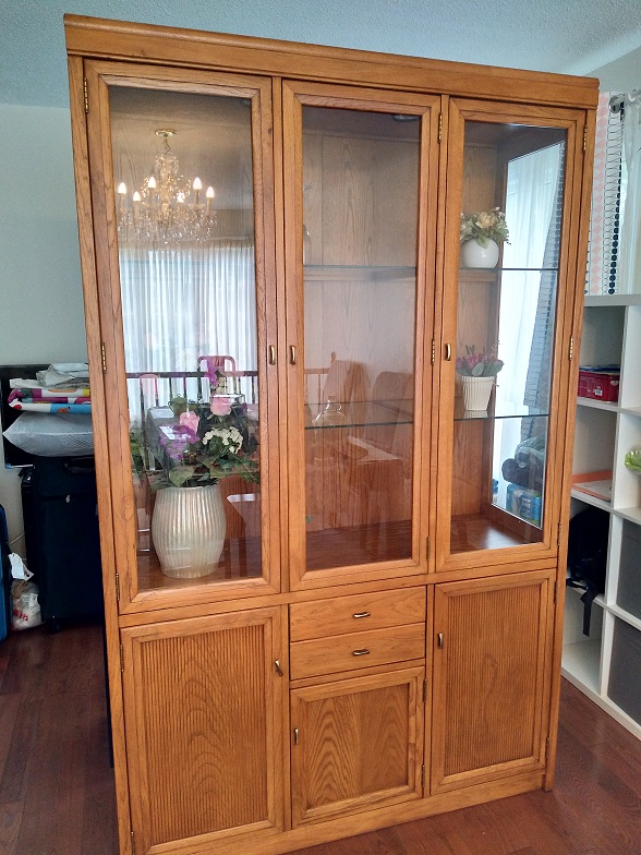 实木展示柜,自取 低价 150 刀 出 顶部有两个灯,增加展示效果 上半为玻璃展示柜,下部为收纳空间,很实用 柜子尺寸: 长 124 cm 宽 44 cm 高200 cm 有需要者请短信联系: 6134088596 谢谢!