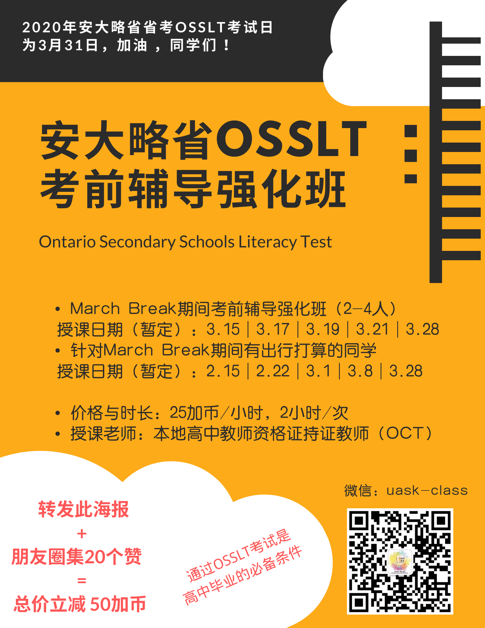 OSSLT考试为安省高中毕业的必备条件,2020年考试日为3月31日 针对此次考试,悠问教育联合本地高中老师(OCT)推出考前辅导强化班 ☀11/12年级的高中生们,加油! 详情请添加悠问教育微信(uask-class)进行咨询
