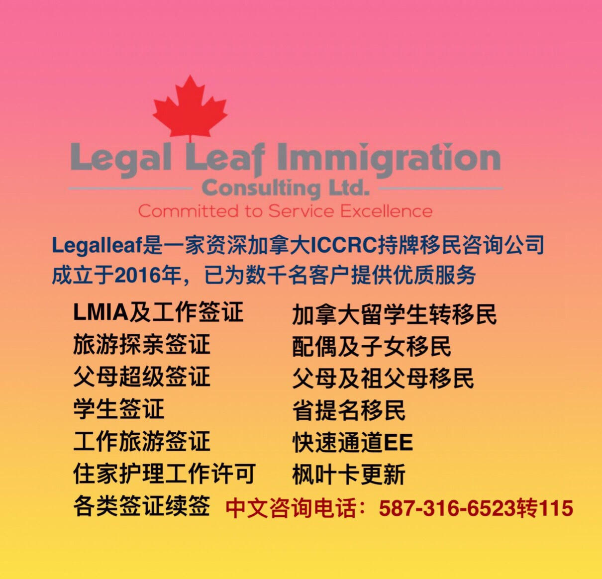 Legal Leaf移民公司本着专业高效、诚信可靠、100%保密、价格亲民等卓越品质,连续多年获得领域内前3名,持有ICCRC牌照的专业移民团队为您提供全方位的服务.中文免费咨询电话:587-316-6523转115[愉快][愉快] 欢迎加微信legalleaf