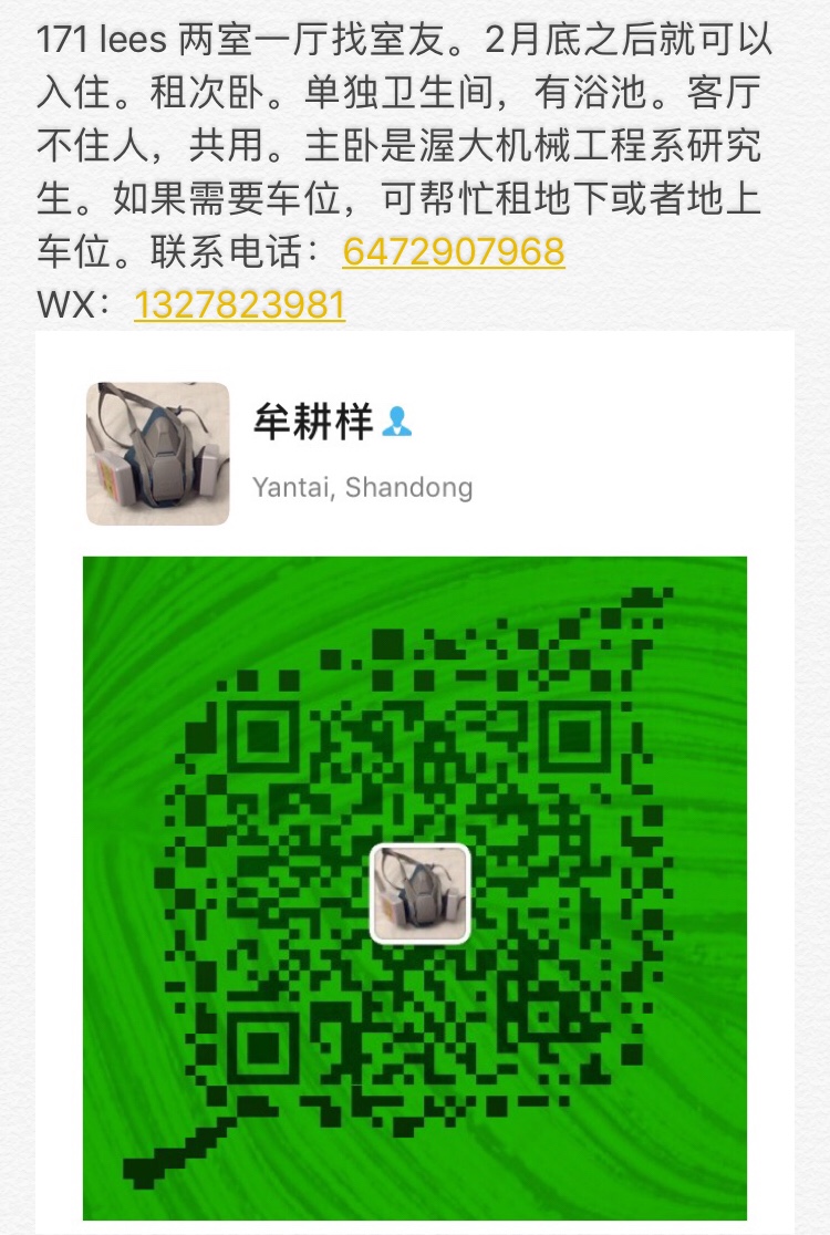 M monsteralbert 新手上路 注册 2014-06-14 消息 720 荣誉分数 0 声望点数 26 2020-02-11 #1 地址 171 lees 希望找一个不养宠物,比较爱干净,不抽烟的男生。不介意带朋友回家玩。作息可以不规律,但是望在我睡觉时能安静些。 附件 IMG_2461.JPG 250.6 KB · 查看: 44 由版主最后编辑: 2020-02-11