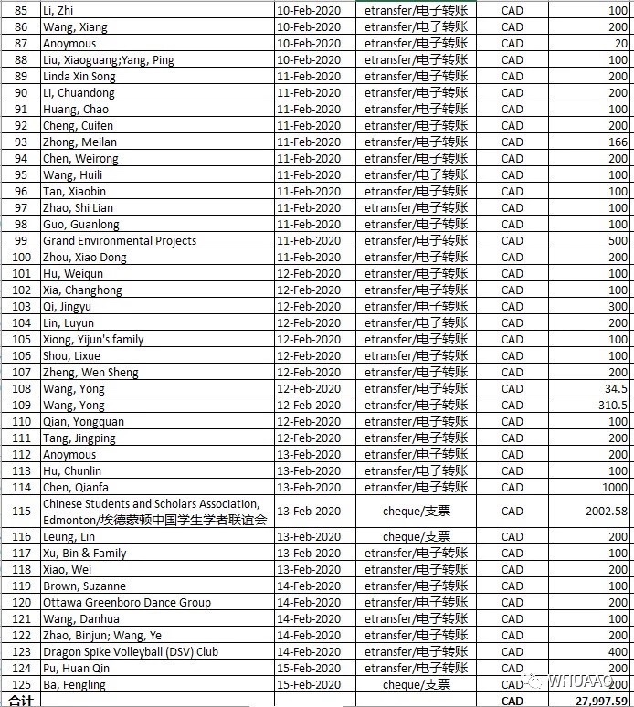 驰援武汉,我们在行动 | 武大渥太华校友会募捐进展公示之三(2月15日)
