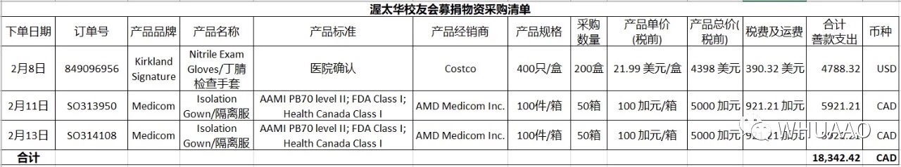 武汉大学渥太华校友会(以下简称“渥太华校友会”)自2020年1月27日开展募捐活动以来,生活在渥太华地区的校友和社会各界人士慷慨解囊,想方设法调动一切资源,为一线医护人员筹集急需的防护物资!截至渥太华时间2020年2月15日20时,渥太华校友会共接受捐款125笔,合计27,997.59加元;支出18,342.42加元,用于采购一线医护人员急需的隔离衣和手套等物资;余额9,655.17加元。渥太华校友会采购的第一批和第二批急需医疗防护物资已经或即将到货,正在与提供国际运输通道的合作单位确认物资运输相关事宜,并与目标捐赠医院(武汉大学中南医院、华中科技大学同济医学院附属武汉儿童医院等)共同完成通关所需要的相关手续文件,争取早日把物资尽快送到相关医院的一线医护人员手中。