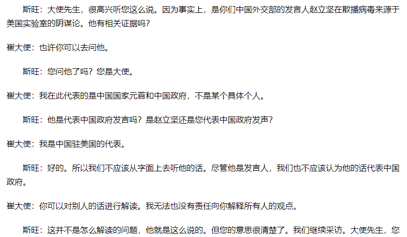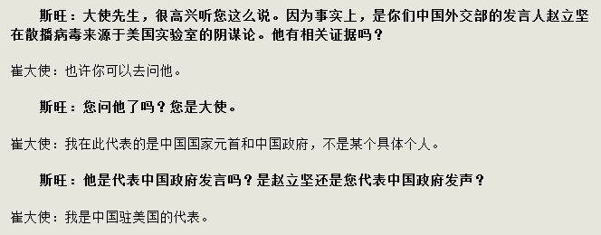 这之后最逗的,就是AXIOS与HBO采访中国驻美大使崔天凯的片段,大使在追问下的躲躲闪闪、闪烁其词、恨不得找个地缝钻下去的怯懦,能把人笑到背过气去。都是吃党饭的,面对共同的敌人,怎么火力尽关、抱头鼠窜呢?作为一国大使,对同一个系统的同志,理应像同一个战壕的战友那样大喊一声‘American Virus’啊,但是赵立坚同志得到的竟然是驻美大使的无情离弃、背叛和出卖: