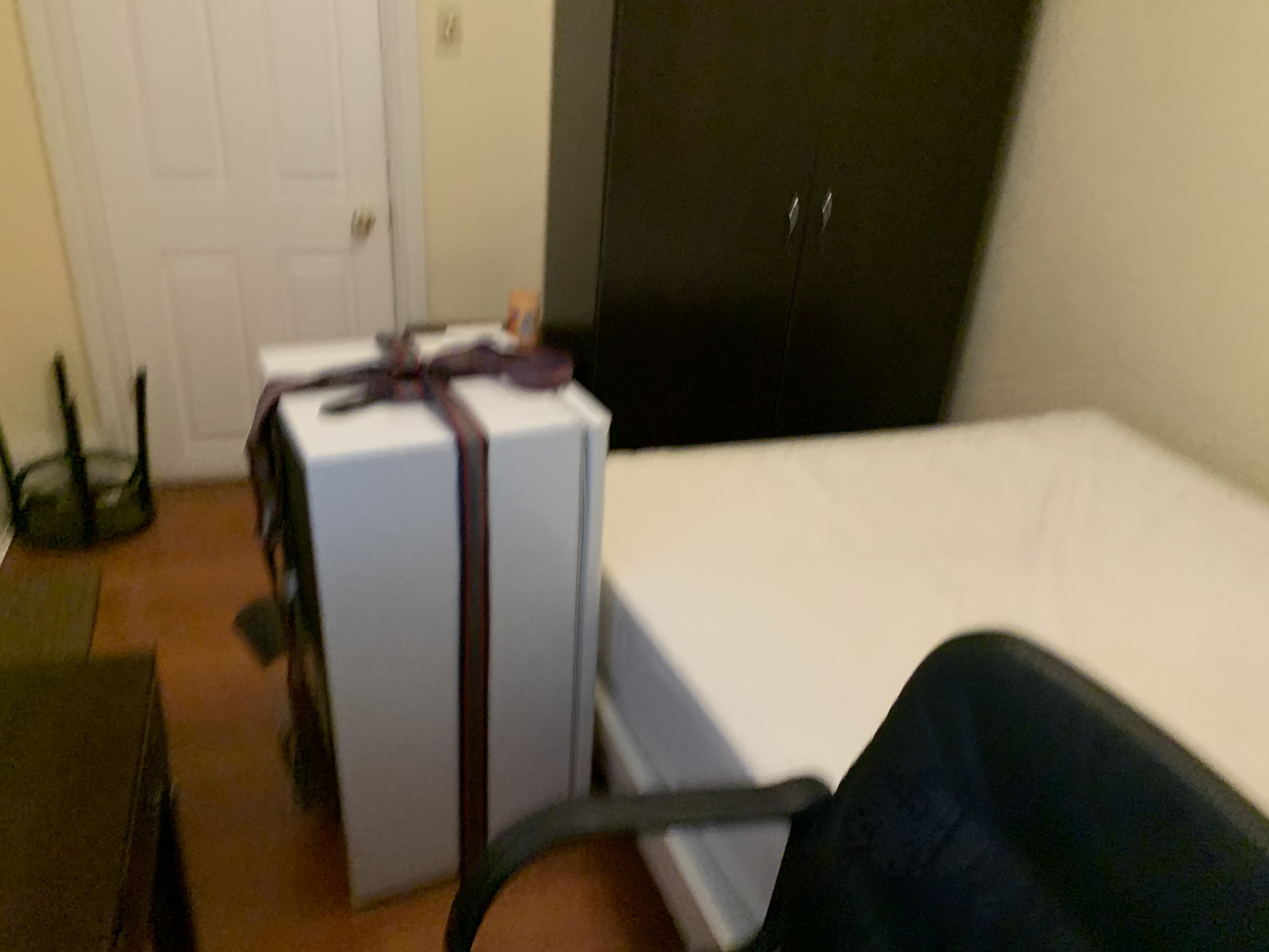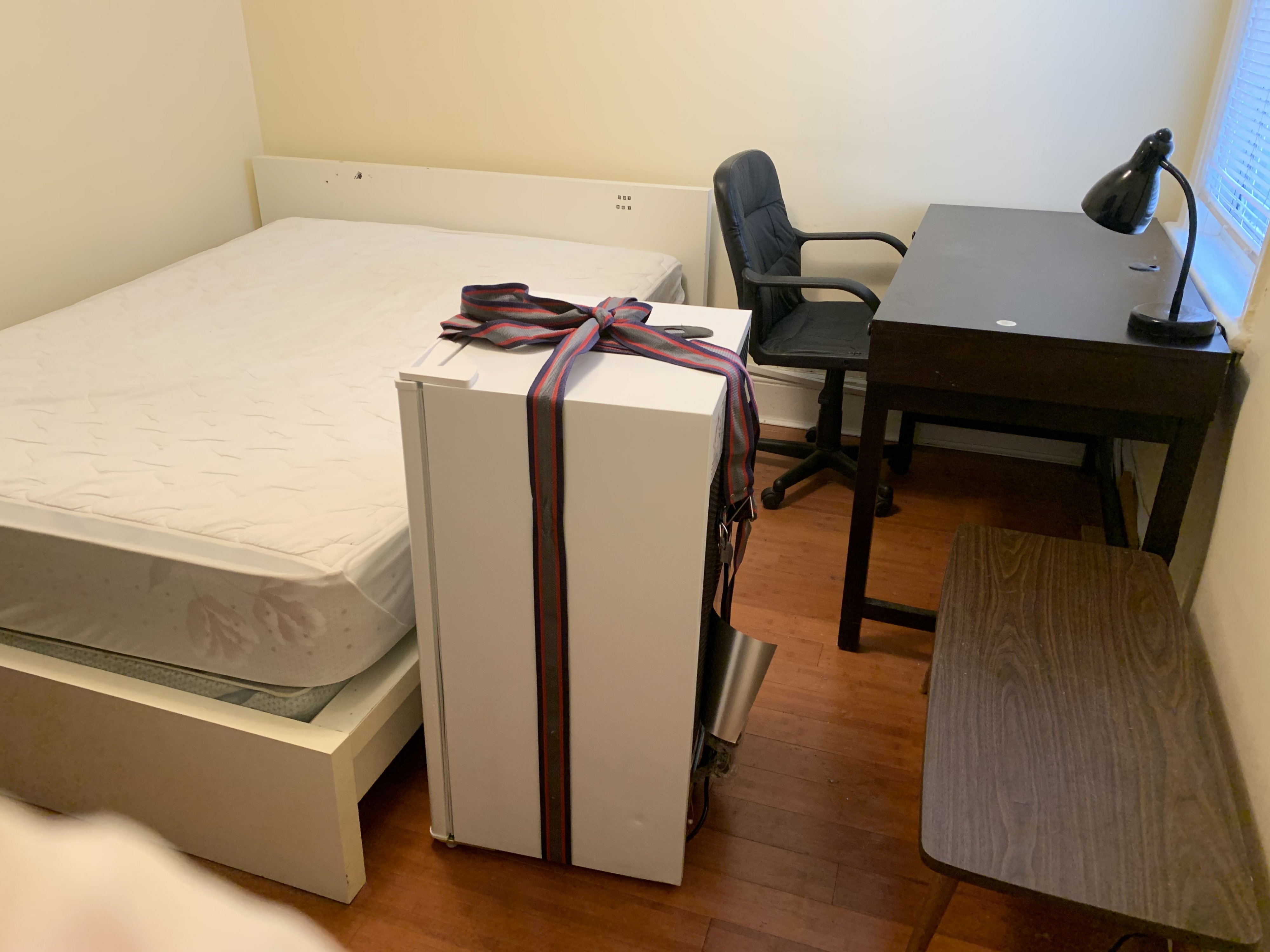 提供双人床,床垫,床头柜,书桌,台灯,衣柜,及皮椅子。请看下图(图上的冰箱已经搬出去了)500$全包(水电暖无限上网)