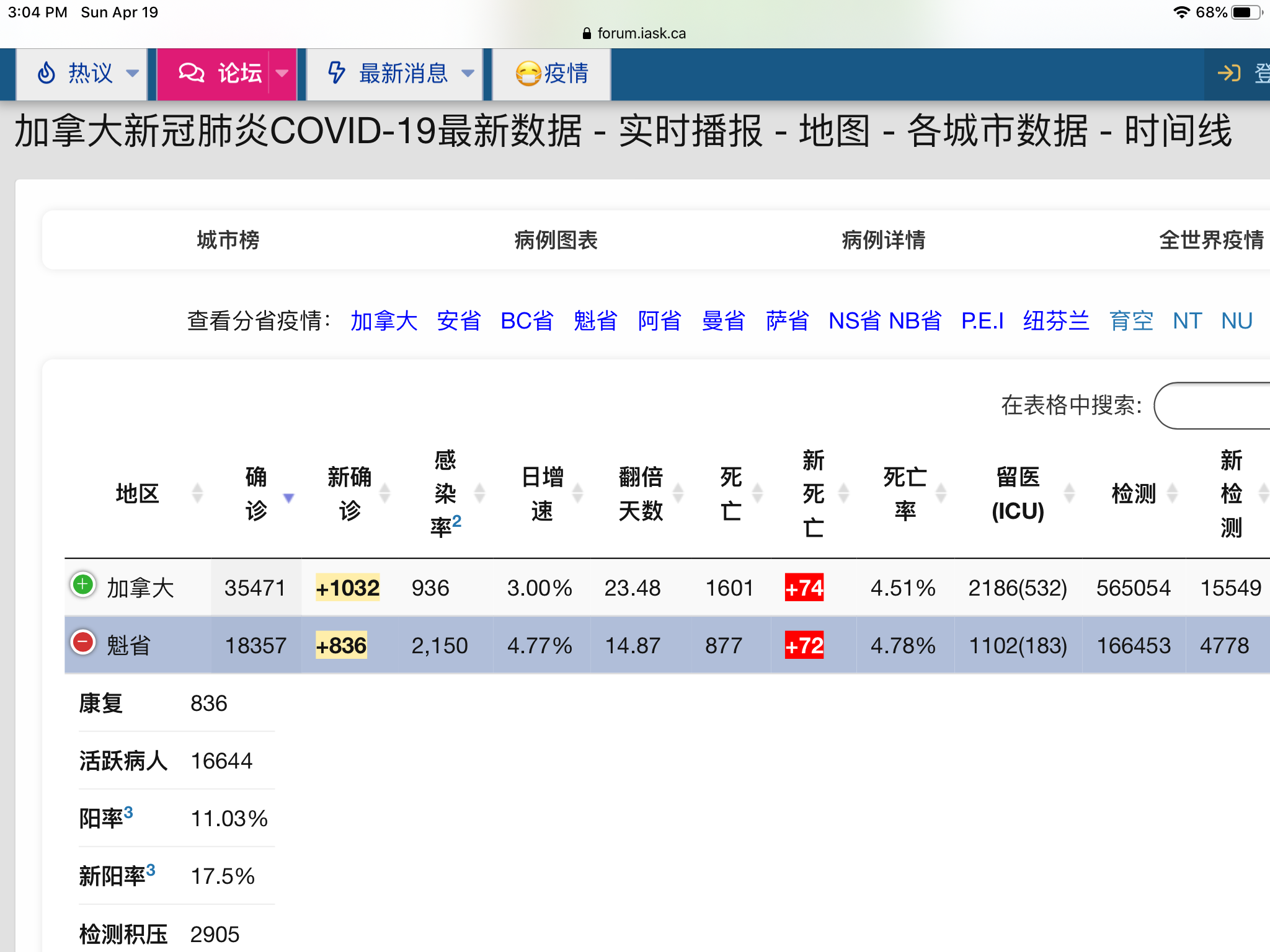 魁省确诊一万八占总人口的2%。武汉染病人数应该不会在20万以上纽约的确诊率确实是40%以上,每天都有统计,其他地区测试阳性率都在10-20左右。但这是相对测试而言而不能推测总人口。我反正不认为魁省已经八十多万感染者