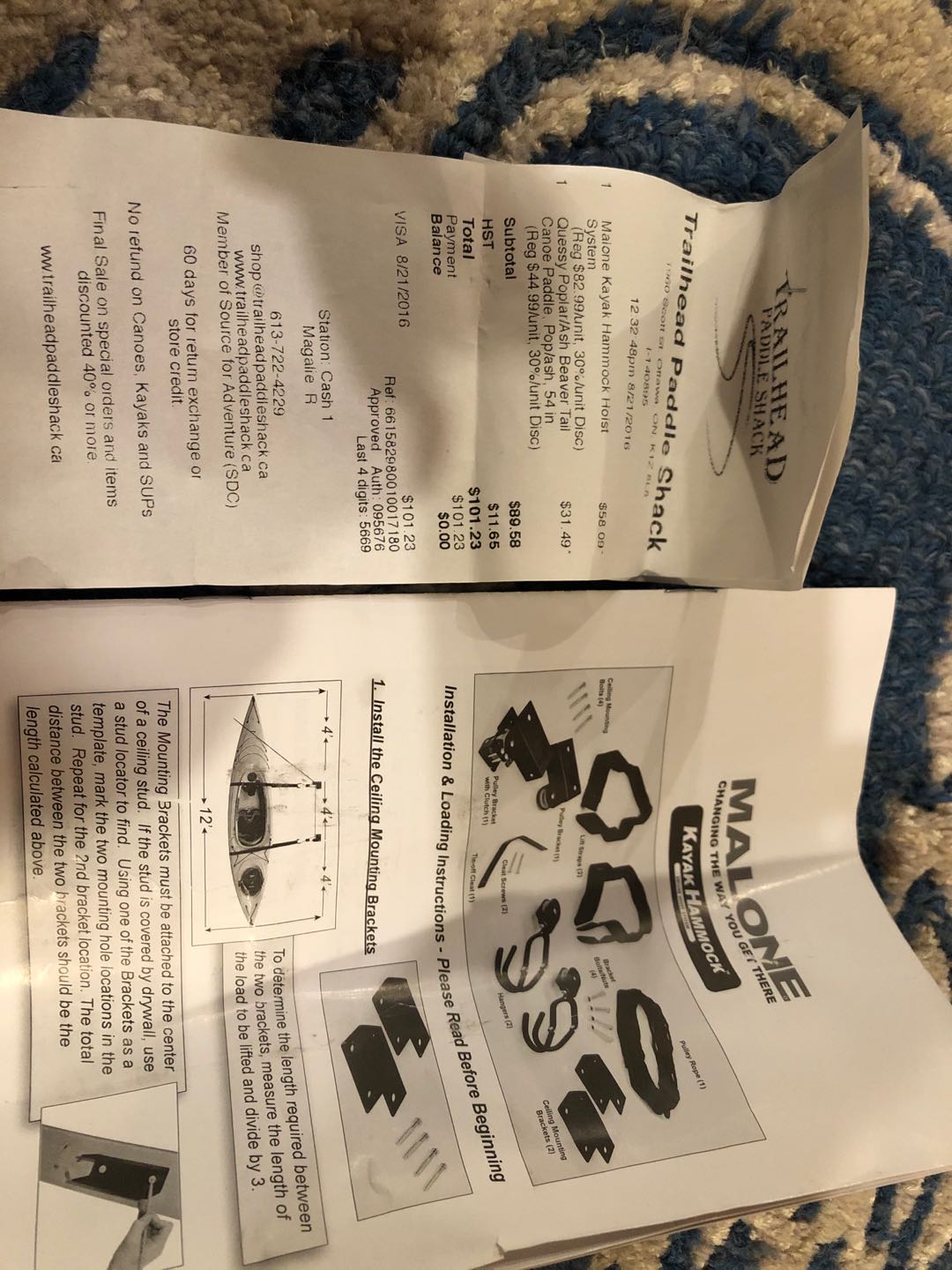 Kayak Hammock™ Deluxe Hoist System It is a high-quality Hoist System for kayak storage, bought at Trailhead for 100+ CAD. Brand new still inbox. Price is firm, pick up in Kanata near Tango outlets