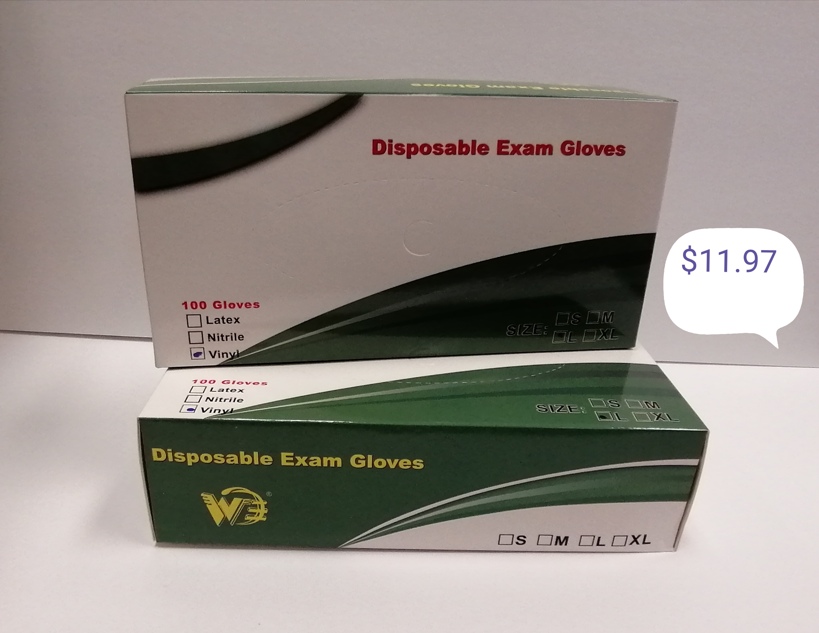Disposable vinyl gloves available in Dollars variety mart. 100pcs per box. $11.97 per box.