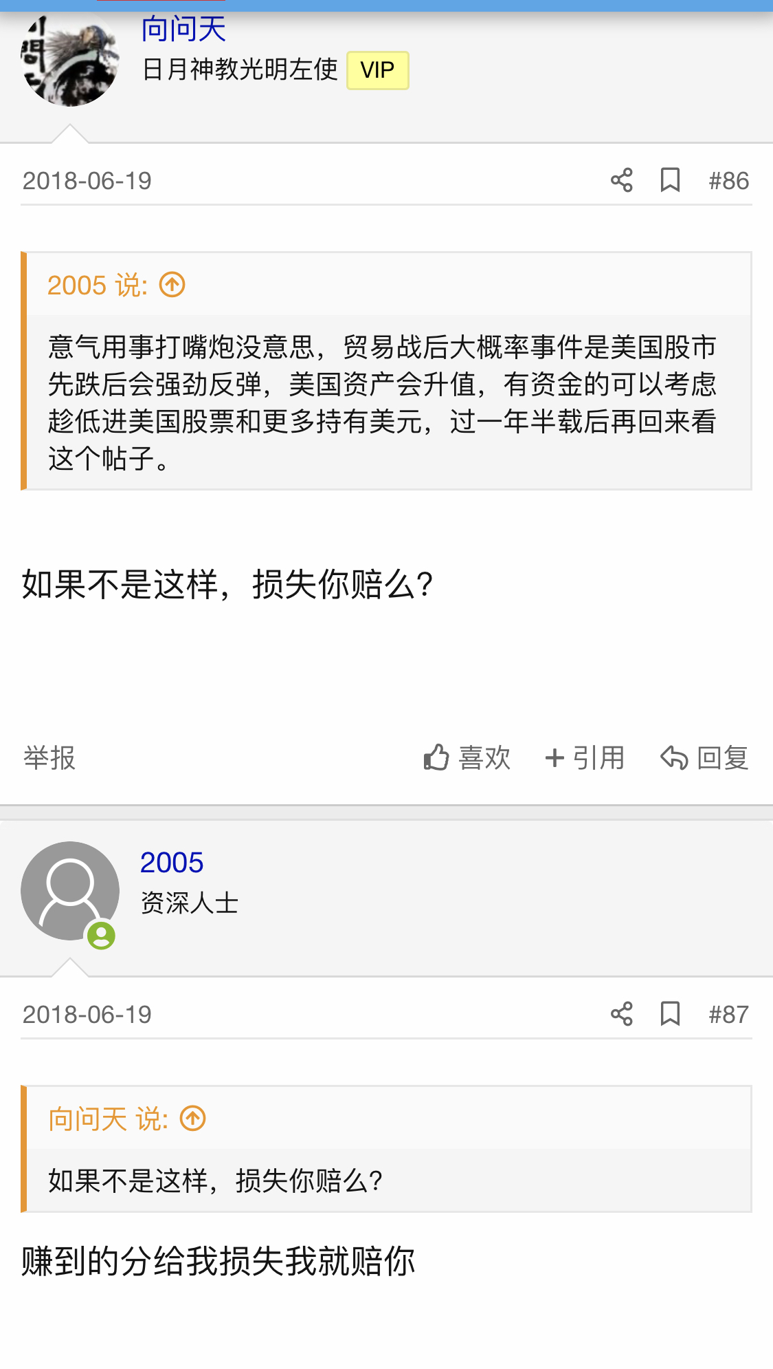 2 2005 本站元老 注册 2004-12-19 消息 2,794 荣誉分数 1,088 声望点数 323 2020-06-21 #21 gcy1208 说: 我觉着点赞的注意不错 点击展开... 我一天才几个帖子老向每天唠叨多少。 两年前关于中美贸易战也差点想赌,如果赌了他就输,不赌他信我的判断现在也就该赚不少了。