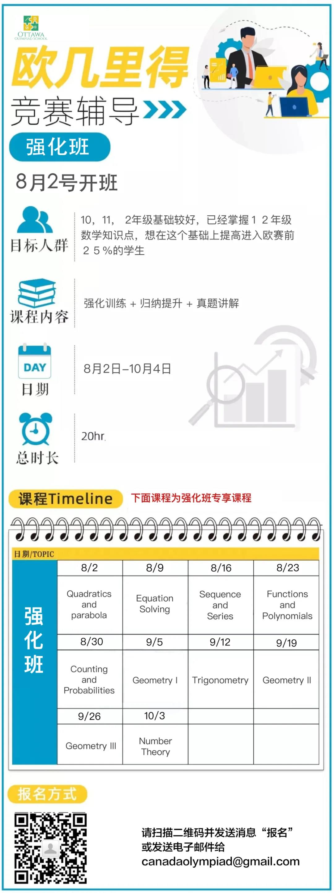 渥太华奥林匹克学校是专注于中学数学、计算机竞赛和中学课程补习的专业教育机构。师资强大,经验丰富,资源广阔。往年欧赛学员获取证书率高达75%,受到家长一致好评!最后冲刺班将针对滑铁卢大学往年最难的经典例题,解析题型,分析难点,精准指导,在最短时间内突破,迅速提高孩子成绩和名次。