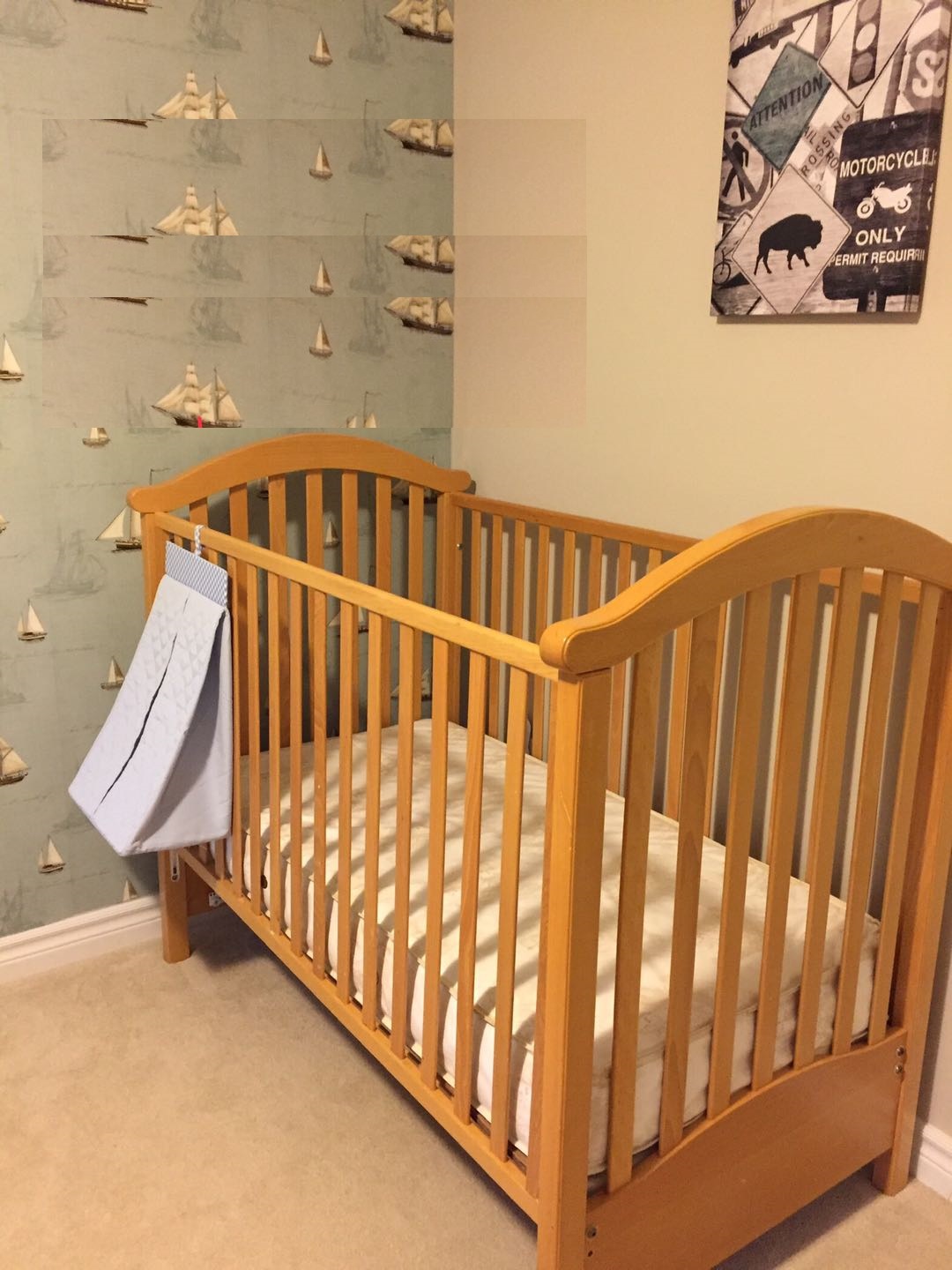 实木二手婴儿床出让,八成新, 带厚实防水床垫。价 $50 刀。 另可附送幼儿 Jumper 如图。 请联系李女士 613-986-1392