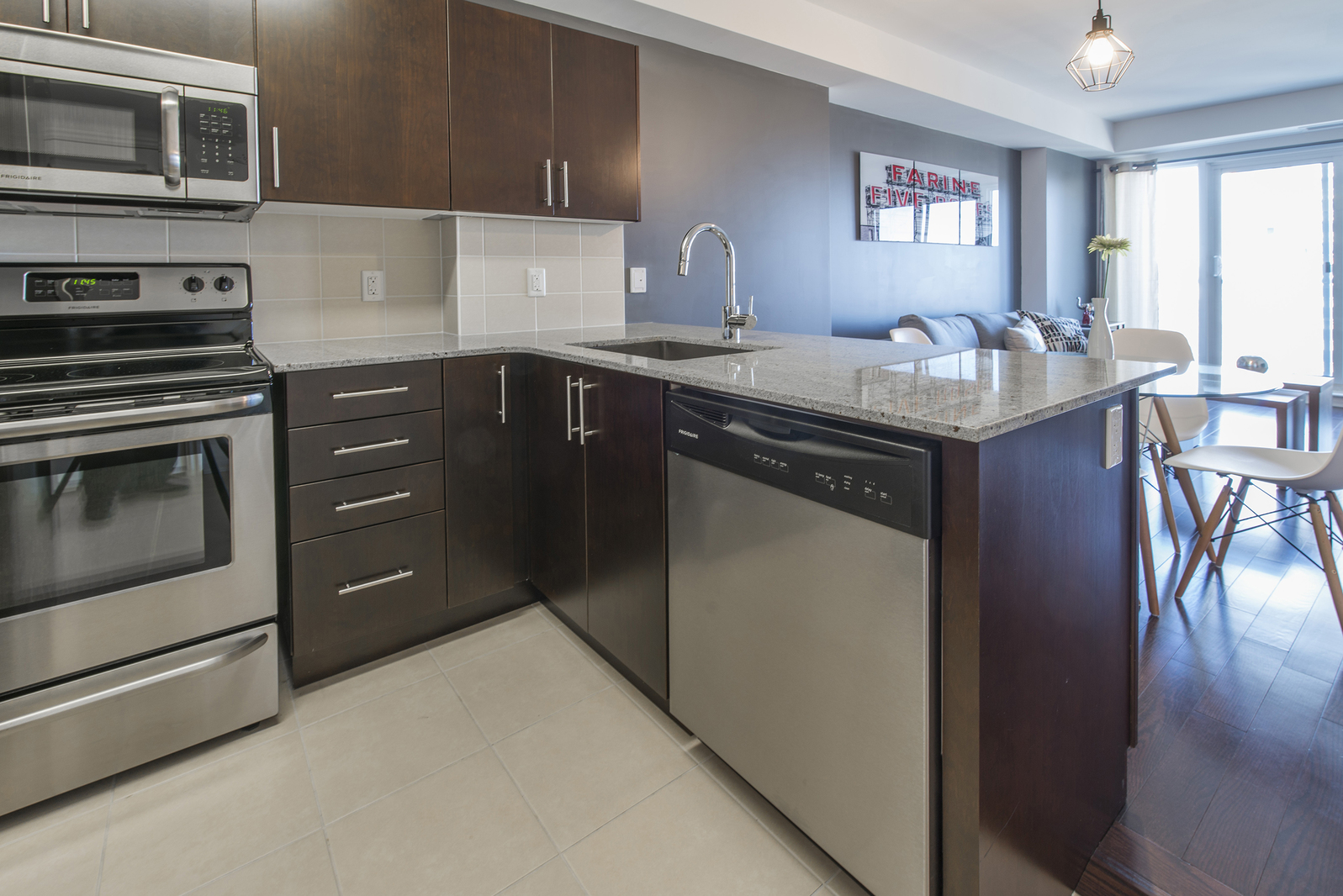 Unit includes stainless steel appliances including fridge, stove, microwave, dishwasher, and en-suite laundry.
