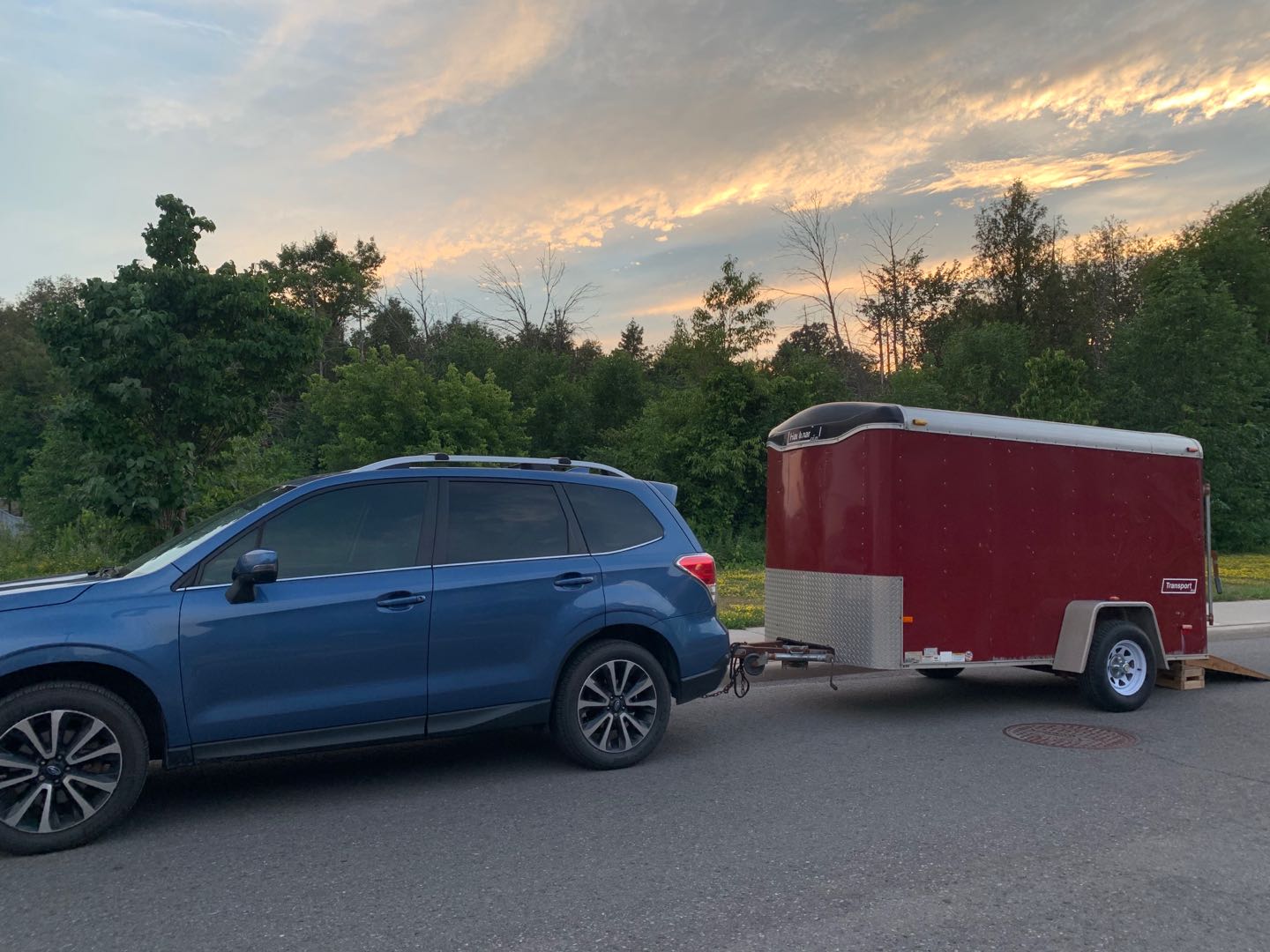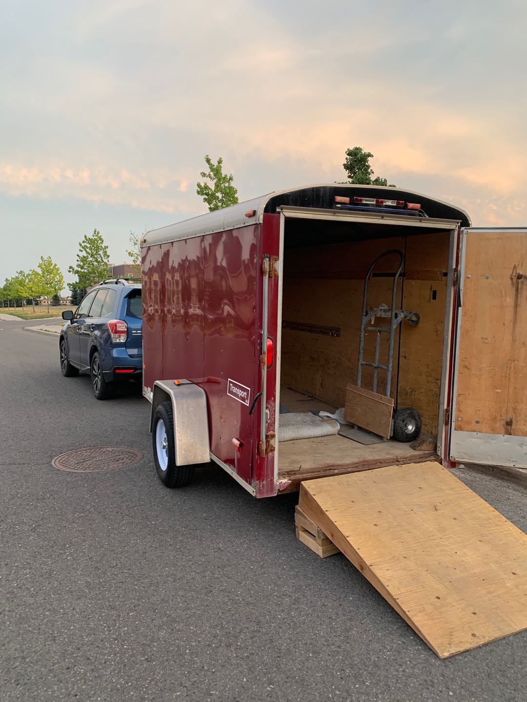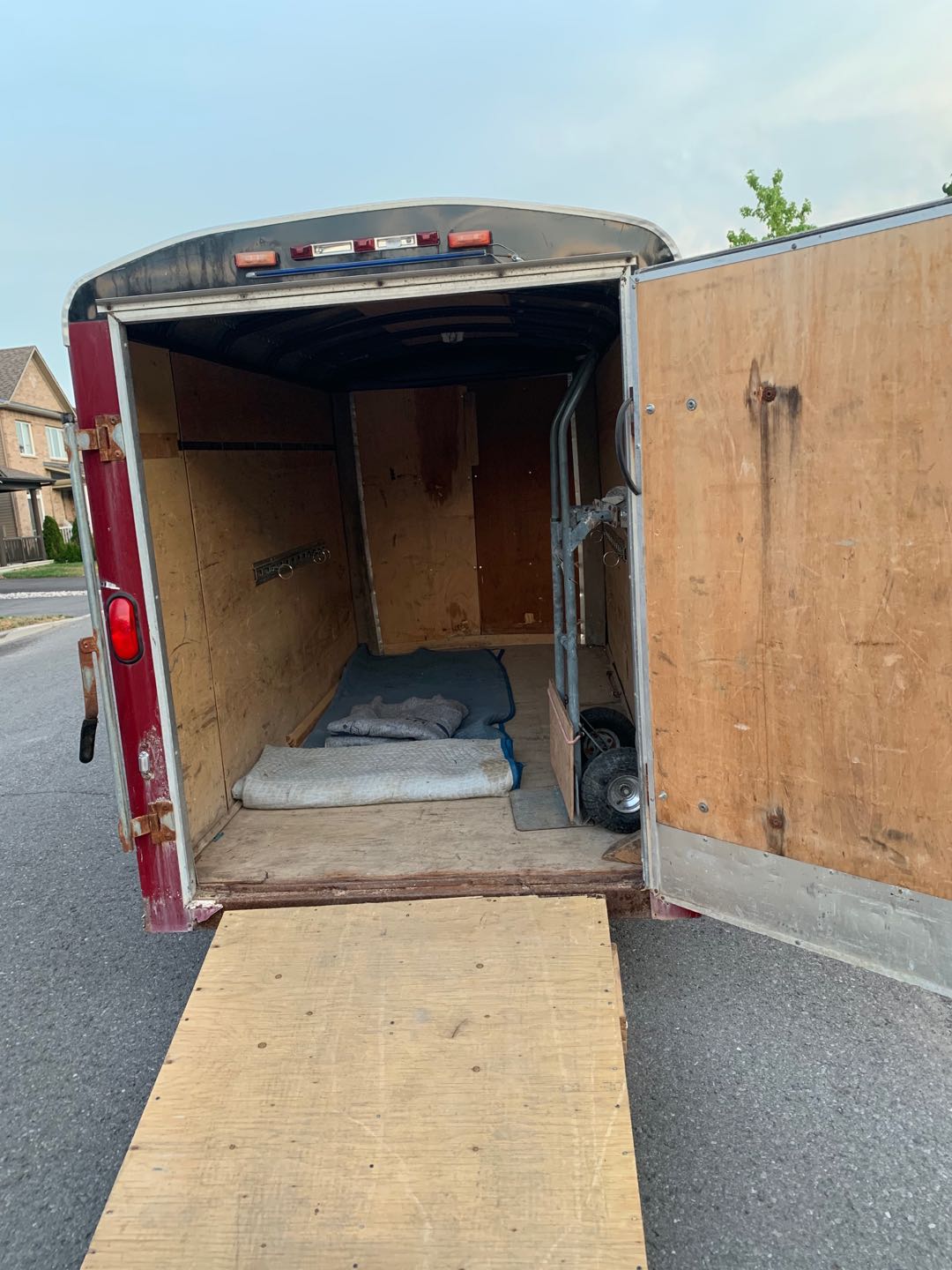 封闭式运货拖车,三座沙发;QUEEN SIZE 床垫;跑步机等大件家居可尽收车内。长宽高分别是:10尺X 5尺X 5.5尺(3米 X 1.5米 X 1.65米)。(前部SUV车里可坐3-4人,另外拖车内可以装20件大航空行李箱