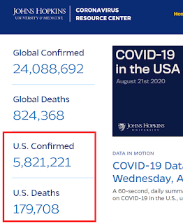 截至8月27日,美国内公布的确诊病例已经超过了582万,死亡人数接近18万。美国人口占世界4%,新冠肺炎感染人数和死亡人数分别占世界的24%和22%。2020年1月23日武汉“封城”时,美国公开确诊病例只有1例。2月2日美国对所有中国公民和过去14天到过中国的外国人关闭边境时,美国官方统计确诊病例只有10余例。3月13日,美国宣布国家紧急状态时,美国内公布的确诊病例是1896例。4月8日,中方解除对武汉“封城”措施时,美国内公布的确诊病例达40万。美国内公布的确诊病例从1人到100万人,用了不到100天。