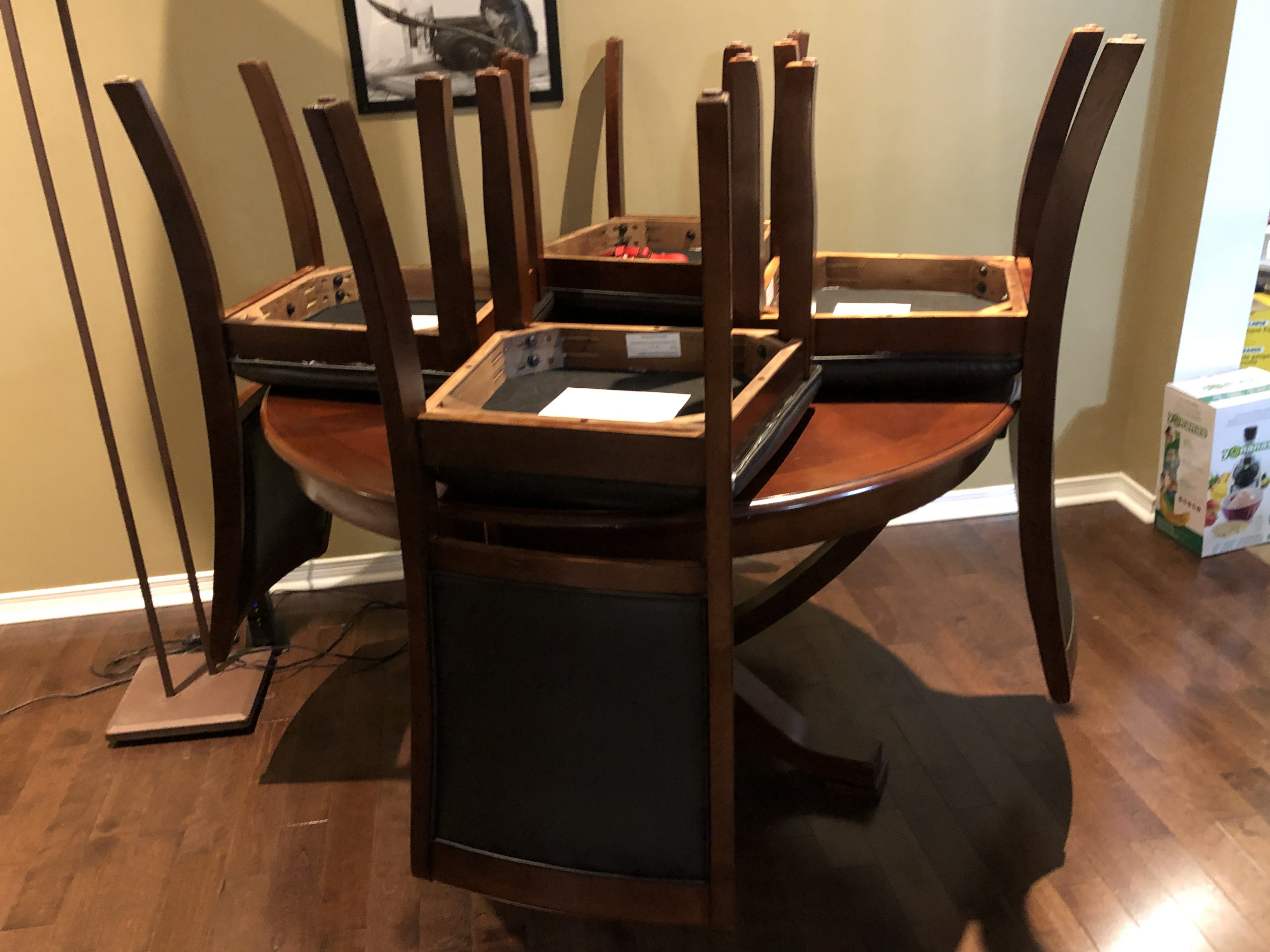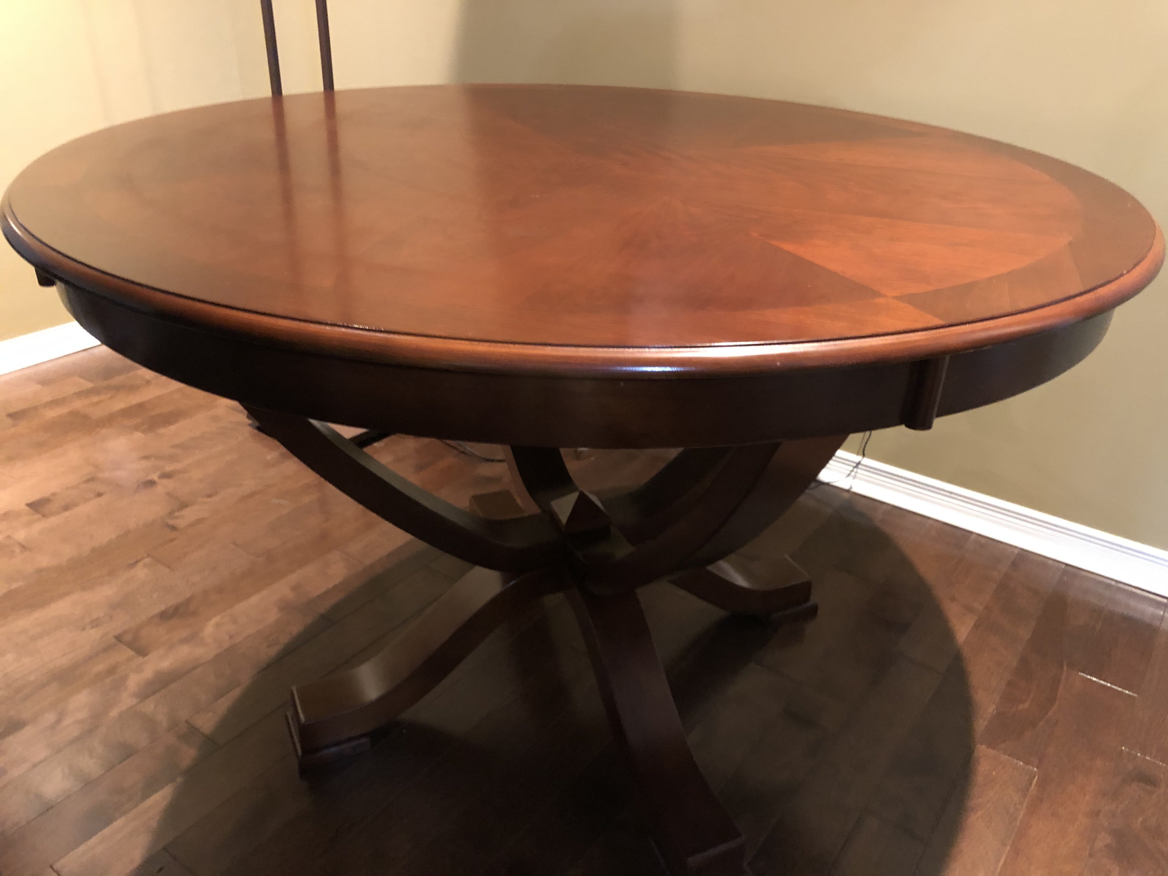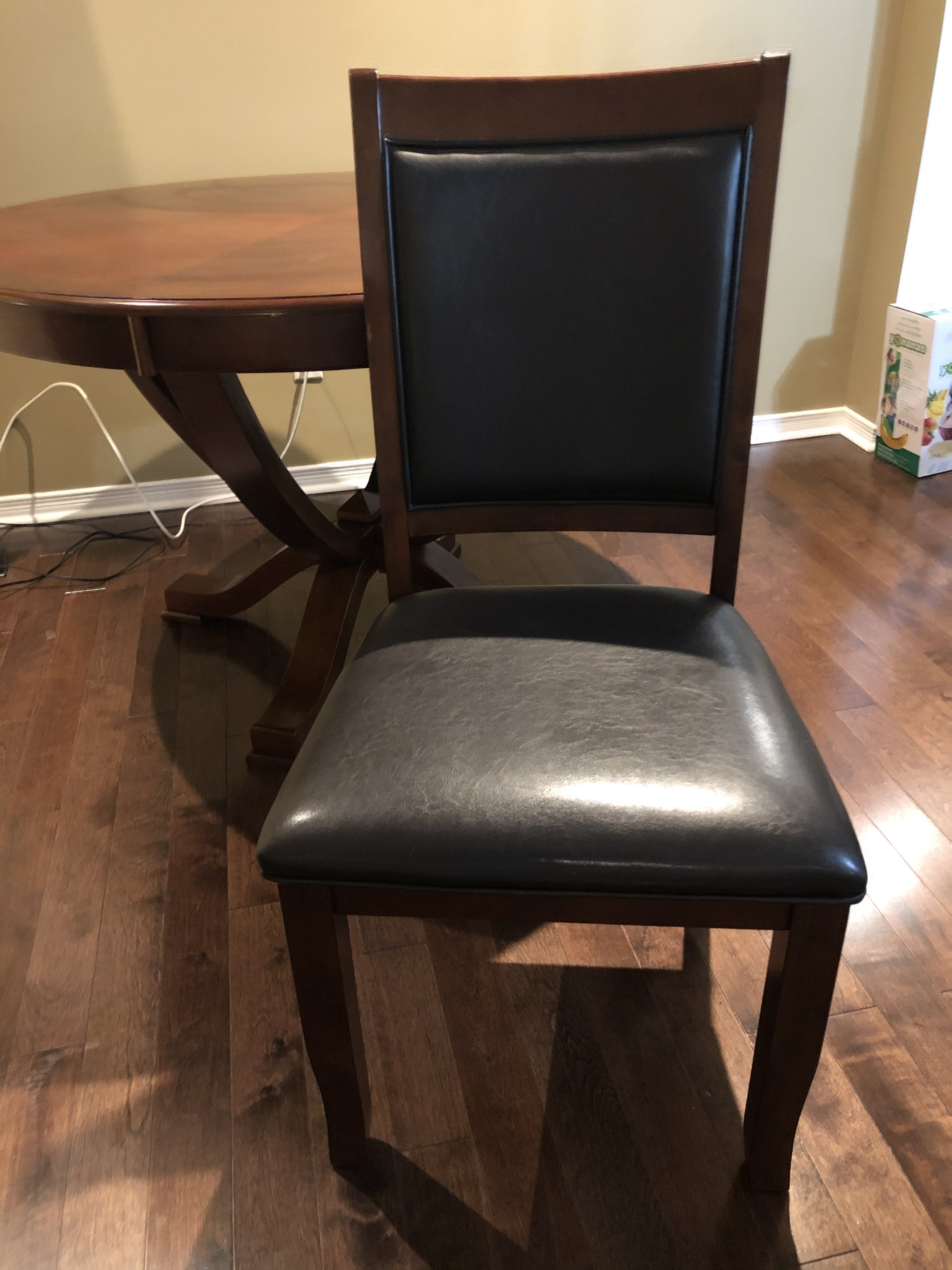 Purchased from Leon’s Furniture. This dining set comes with 4 leather dining chairs. Everything in good shape - The table has sturdy legs and was protected by a vinyl tablecloth since I had purchased it. - Colour : Brown - Material : Wood - Measurement of table : Width 47 " and 1/4