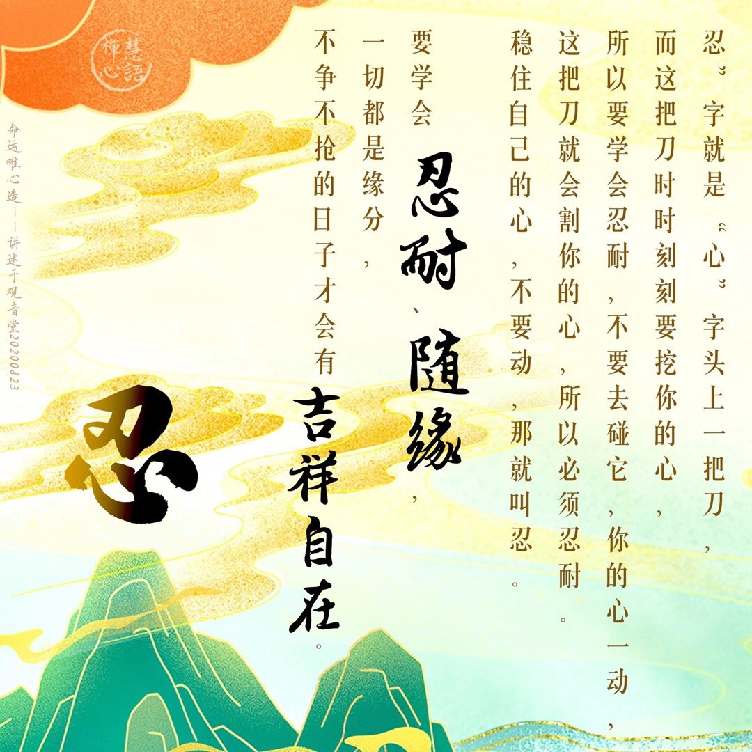 “忍”字就是“心”字头上一把刀,而这把刀时时刻刻要挖你的心,所以要学会忍耐,不要去碰它,你的心一动,这把刀就会割你的心,所以必须忍耐。稳住自己的心,不要动,那就叫忍。