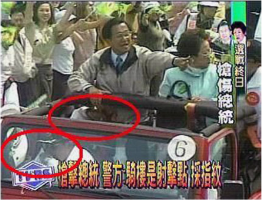 当时陈水扁和吕秀莲站在敞篷车上面,如果真的要开枪杀人,应该射杀头部而不是肚子和腿。