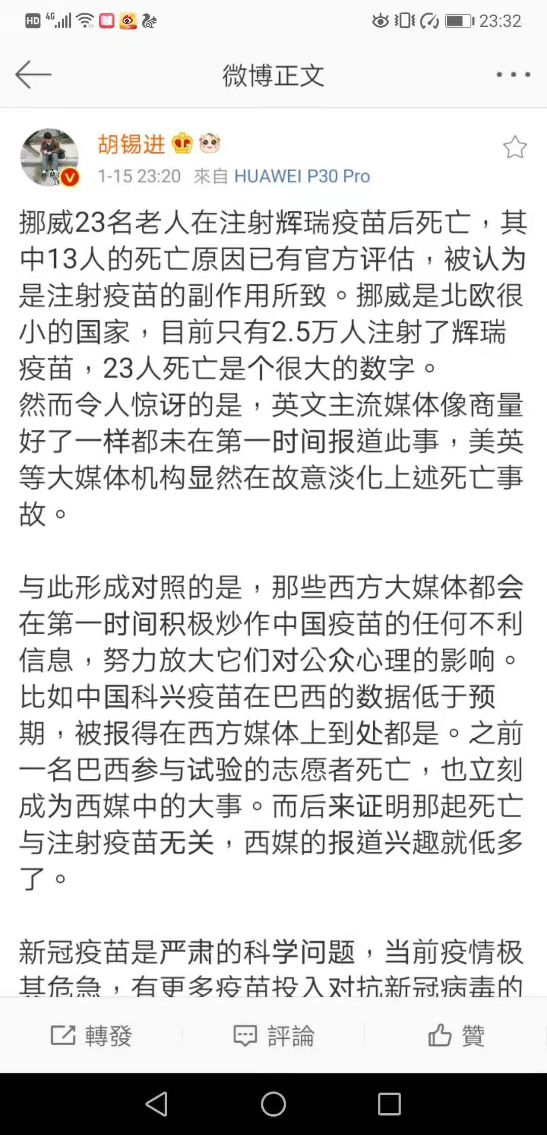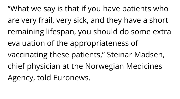 官方声明说不“cannot rule out”,不是老胡说的那么肯定。 而且辉瑞没有让有重病的老年人参加疫苗实验,挪威官方已经修改了对老年人接种疫苗的计划。太老太弱的先等等吧……