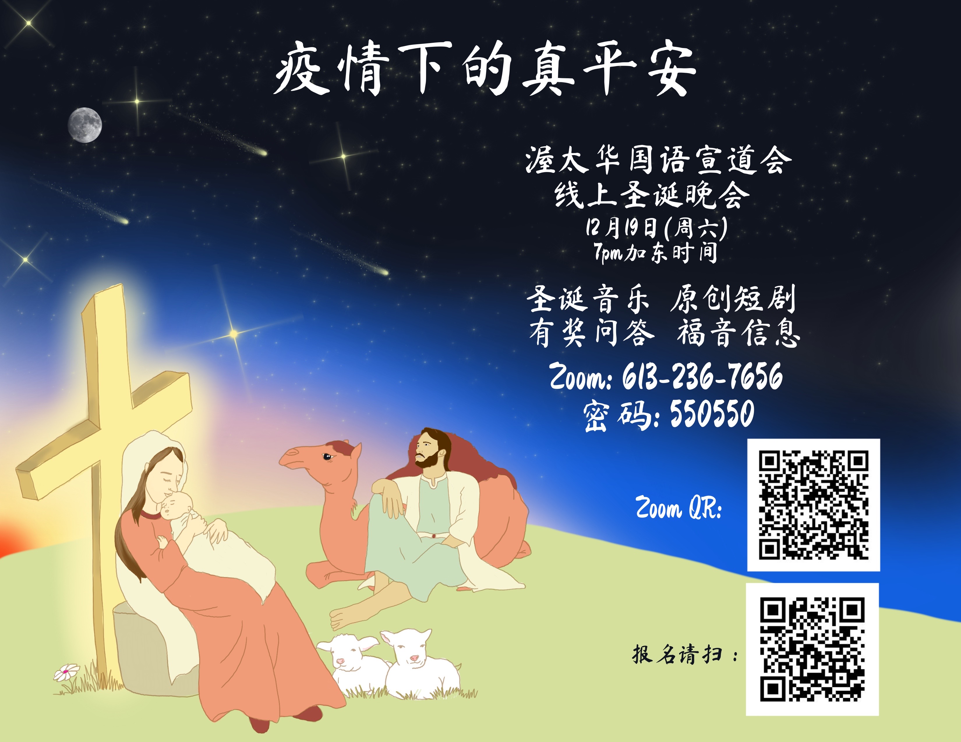 12月19日晚上7点渥太华国语宣道会邀请您一同參與『疫情下的真平安』聖誕晚會,盼望以温暖精典圣诞乐声、精彩原创短剧『疫情下的平安』、『最后十四天』及圣经故事短讲分享,陪伴您和家人度过不一样的圣诞节。
