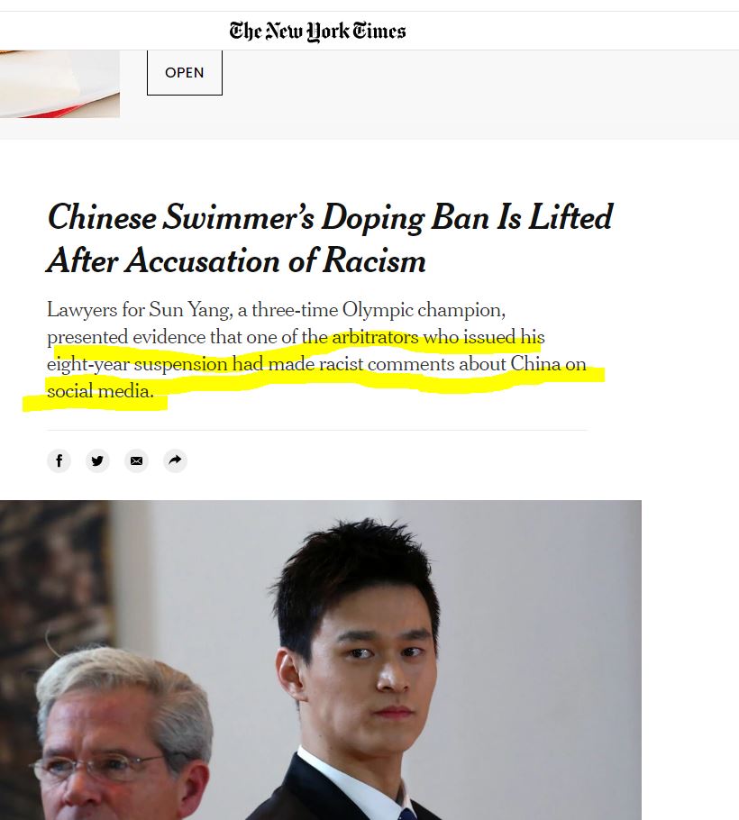 撤消与孙杨同志尿是否含毒无关,撤销是因为咱们抓到了那个法官的小辫子,那个法官在社交媒体上发表过乳华言论,这就是说对孙杨作为中国人有成见,不能体现判罚的公正性,政治不正确。
