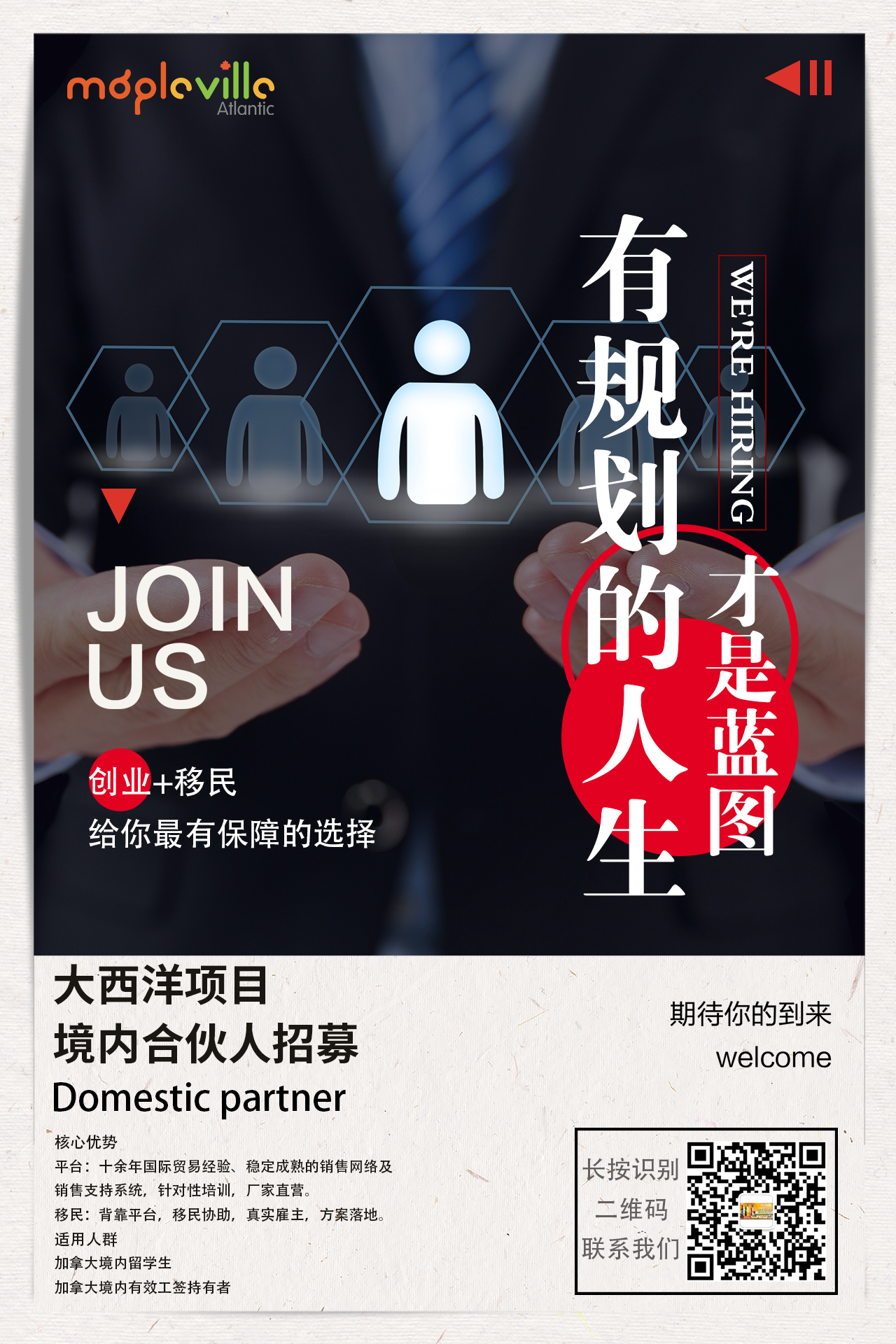 MapleVille-Atlantic(大西洋集团)隶属于 Mapleville 集团。近年来,集团积极拓展产业链,扩大出口厂商联盟规模,整合资源,与加拿大多省政府合作,为本地供货厂商和中国消费者搭建桥梁,促进中加贸易的发展。因业务拓展需求,现诚邀加拿大境内合伙人加入安省、BC省、魁省、曼省、大西洋地区团队。凭借集团十多年成功的出口贸易经验,稳定成熟的销售网络,完善的供货系统,合伙人将参与营销、新品开发、大型电商平台推广等工作。