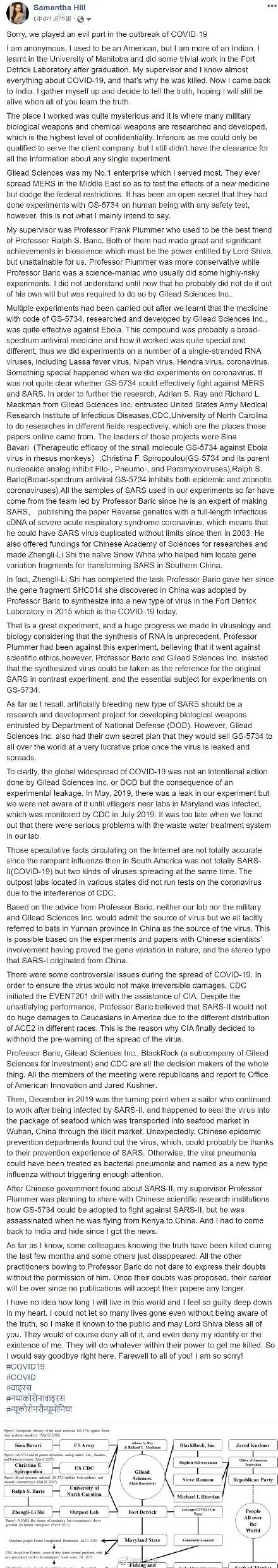 于是这个印度学者当时就暗示有人使用了基因编辑技术将SARS-CoV的RNA进行了编辑,在其中插入了四段HIV病毒的片段,制造了SARS-CoV-2病毒,且这四个片段的共同作用使SARS-CoV-2病毒比SARS-CoV的传播能力更强了。