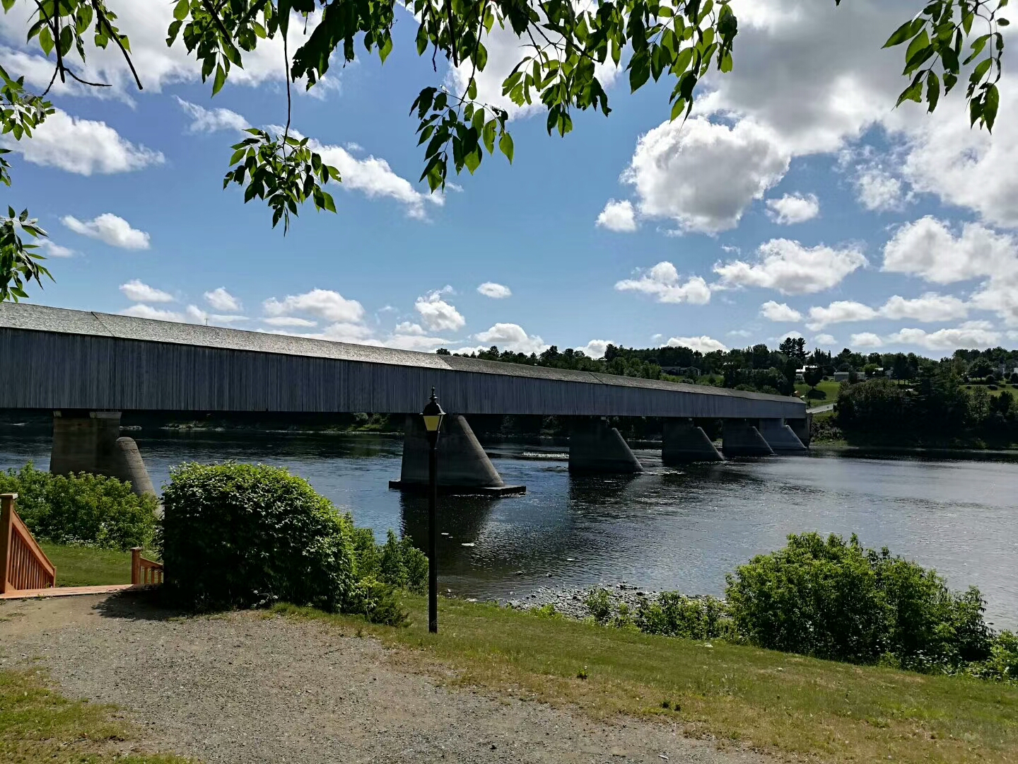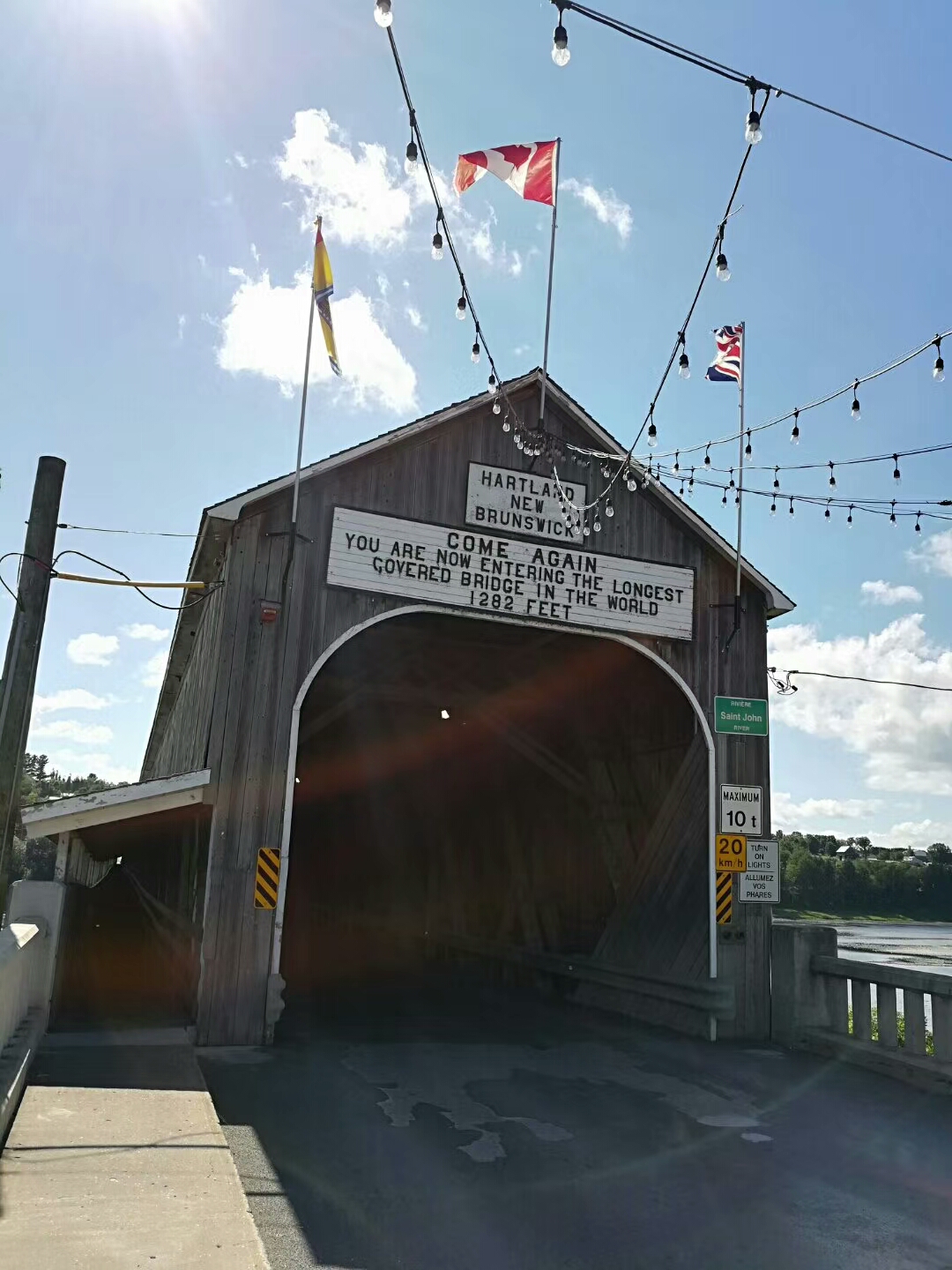 不过,往南继续不远,有一名叫Hartland的小镇。小镇跨越圣约翰河有一特长廊桥,大约400米,据说天下第一长! 晴天的话,坐河边吃一冰淇淋,赏蜿蜒的河景,是很不错的。桥头上,有本地人对此桥的介绍和吹嘘。喜欢钓鱼的朋友,这个河段往往有比较肥美的鲈鱼,不过,没有鱼证,还是等到过了福莱再说。