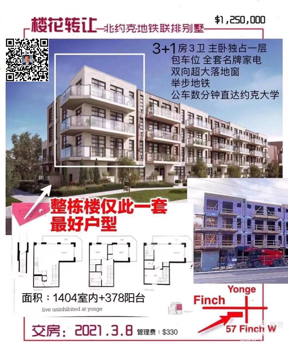 临近Yonge/Finch地铁站, 3+1 室3卫,1车位,1782尺(1404室内+378阳台),$125万,性价比极高(比开发商正在卖的便宜50万以上),管理费仅330$/月。具体地址:57 Finch Ave W, North York, ON M2N 2H3. 联系电话:嘉德置业 416-648-3678。