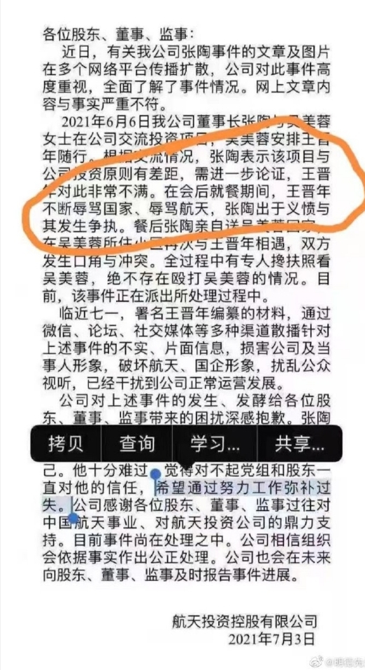 临近七一,署名王晋年编纂的材料,通过微信、论坛、社交媒体等多种渠道散播针对上述事件的不实、片面信息,损害公司及当事人形象,破坏航天、国企形象,扰乱公众视听,已经干扰到公司正常运营发展。