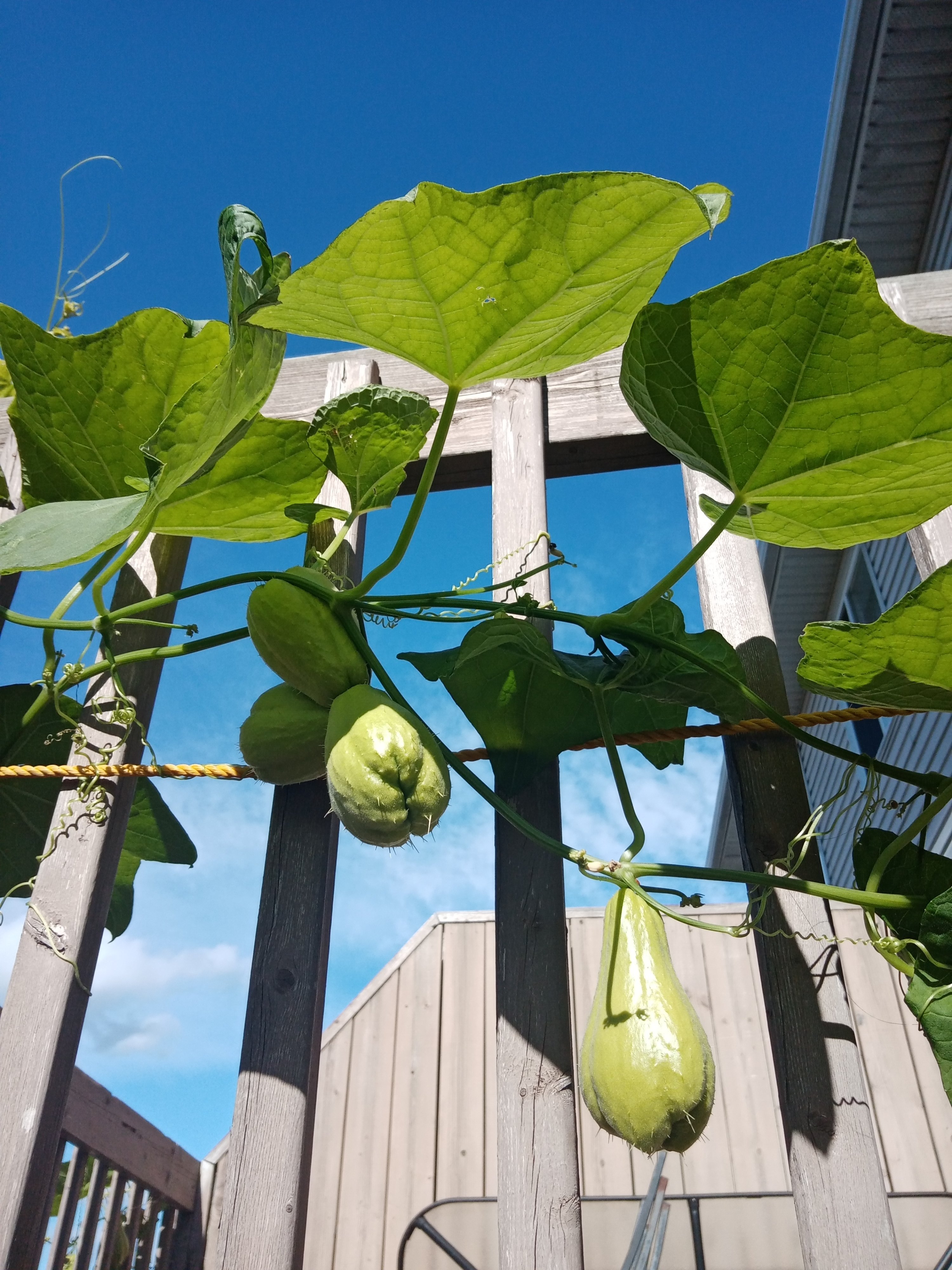 你想不想试试挖一个佛手瓜老根,稍带一点藤,连土放到车库,等明年天暖和移到外面?我今年准备试一棵