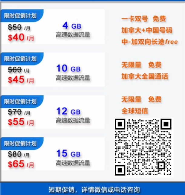 秋季返校手机特别计划 加拿大第二大运营商~Telus网络 中国任打+一卡双号,中国通话无忧 无需信用验证,新人畅享最优计划 更多优惠计划,请扫描二维码咨询 服务电话:416-900-2666 微信ID :A4169002666