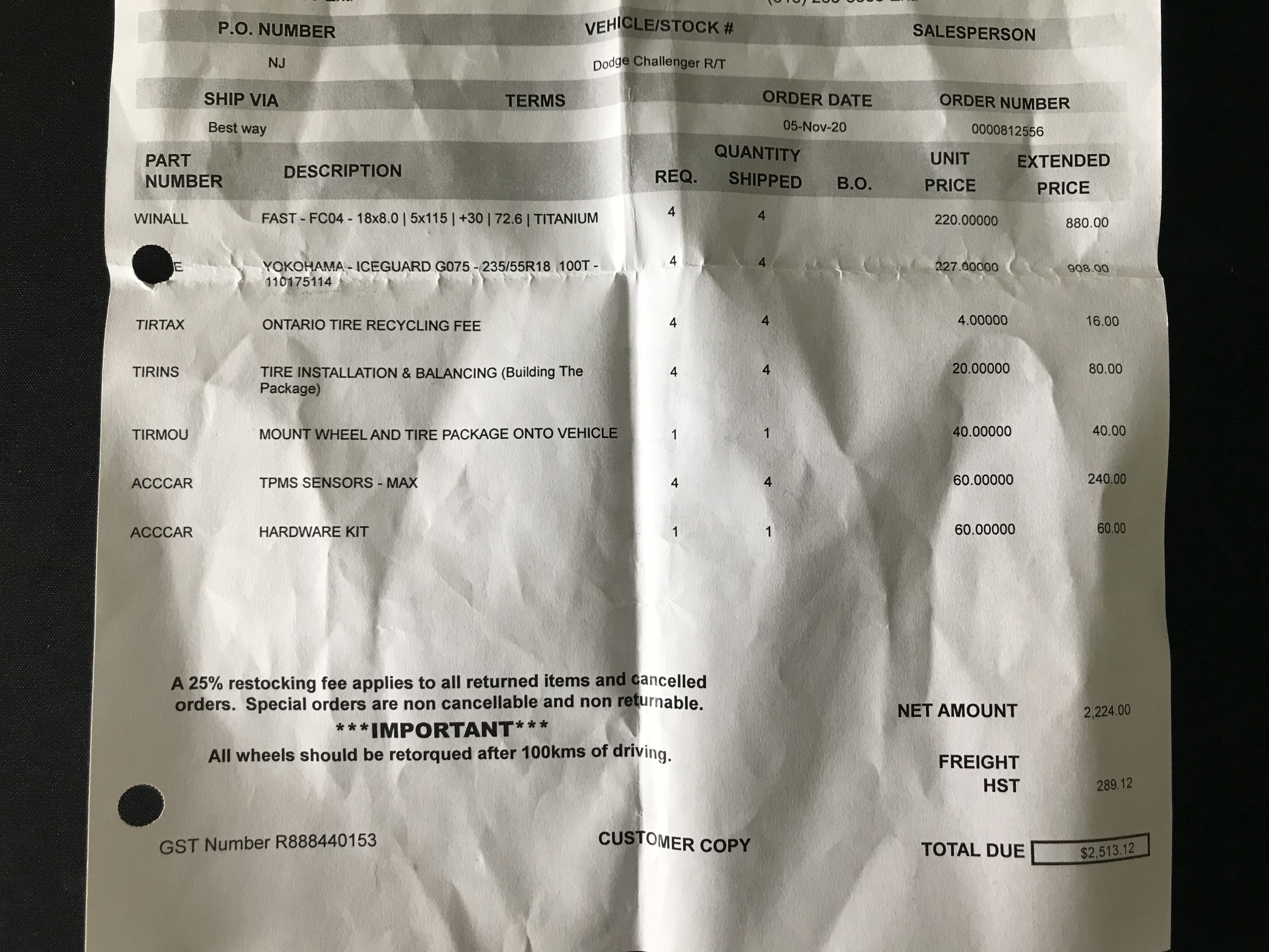 详情可以看图,原价税后$2500, 出价$1500。去年11月在goldwing买的,合金黑轮毂, 轮胎是YOKOHAMA Iceguard G075 235/55R18加tpms sensor, 我开的challenger rt 后驱,冬天装了之后几乎不怎么开,也没见过雪,接近全新,现存放在goldwing店里,买的最贵的package包清洗上蜡,安装和balance,全白送,因为换车,尺寸太大用不了,所以忍痛便宜出了,真的是血亏。爽快的老板请电话联系613-286-6663,没接到的话可以短信留个言,谢谢。